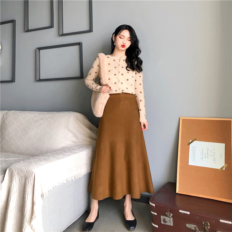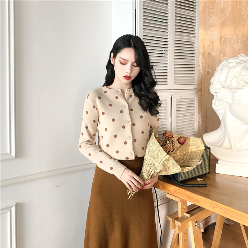 / 韓國ulzzang單排扣百搭波點針織開衫外套女+高腰中長半裙復古套裝