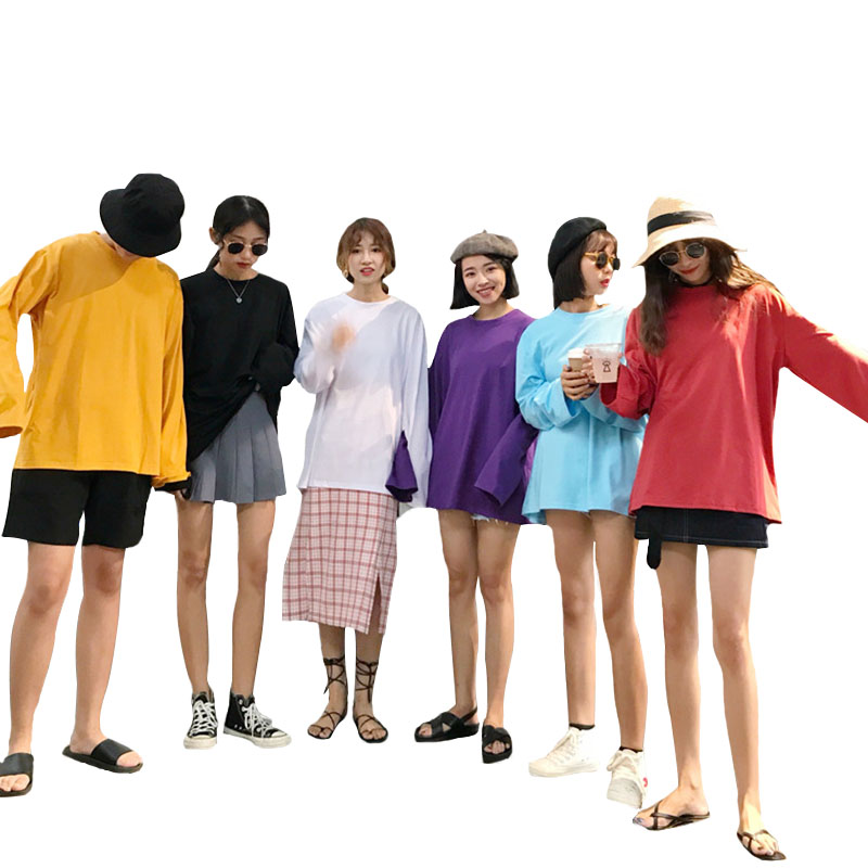 / 秋裝女裝韓版純色寬松百搭糖果色T恤學生中長款長袖體恤顯瘦上衣