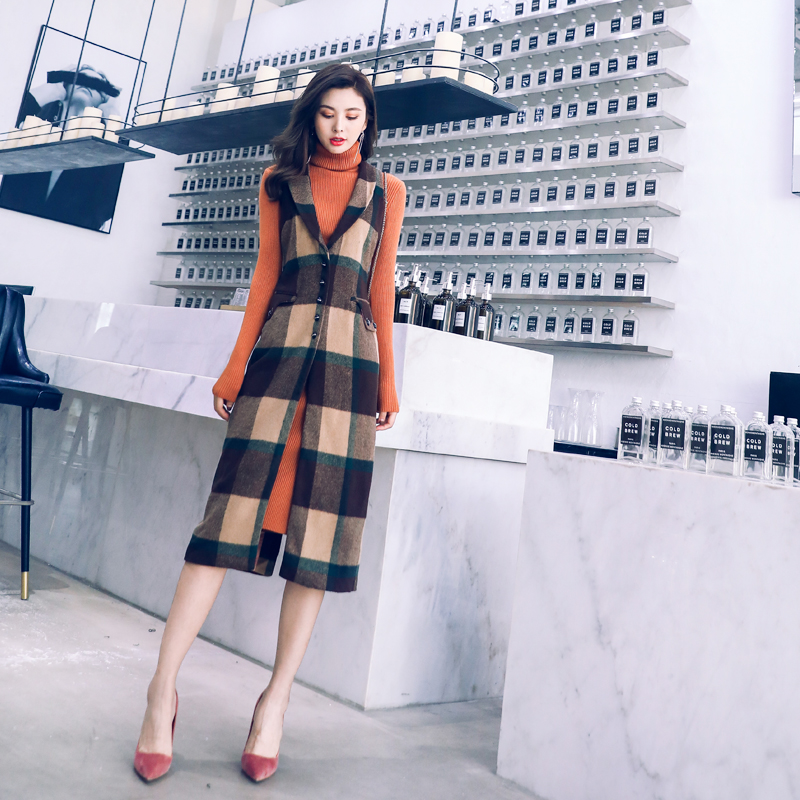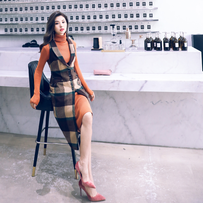/ 名媛氣質馬甲套裝女2018秋新款中長款無袖毛呢馬甲高領針織連衣裙