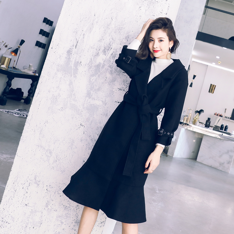 名媛氣質2018直筒大衣秋冬季新款女裝中長款毛呢純色西裝領外套