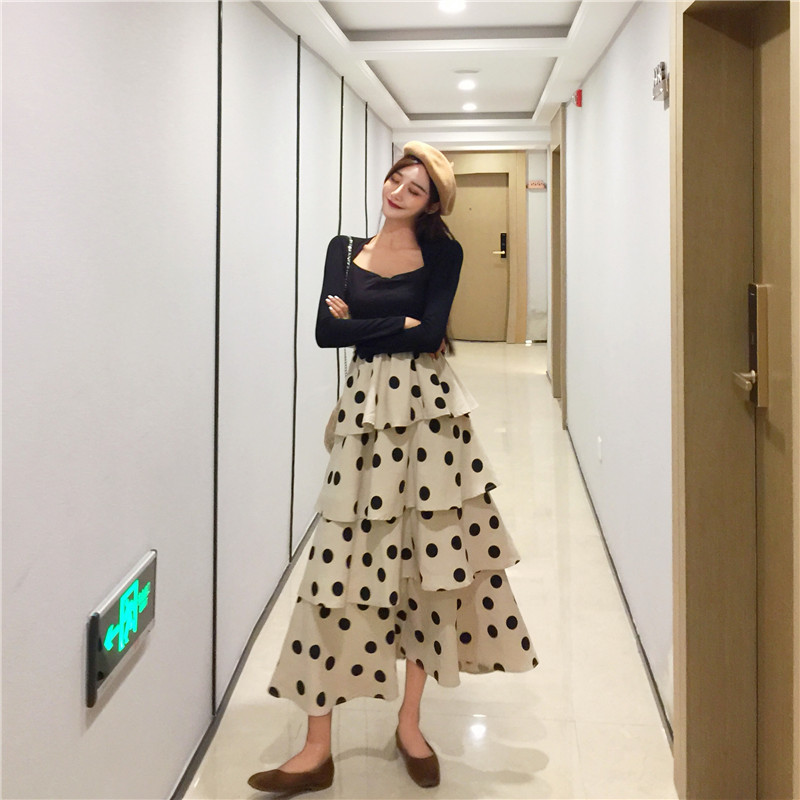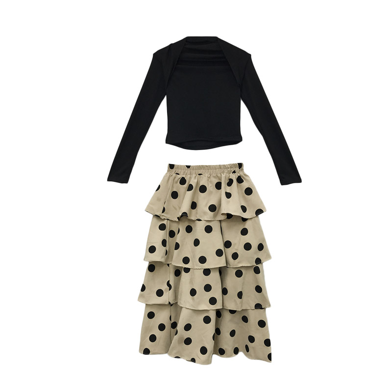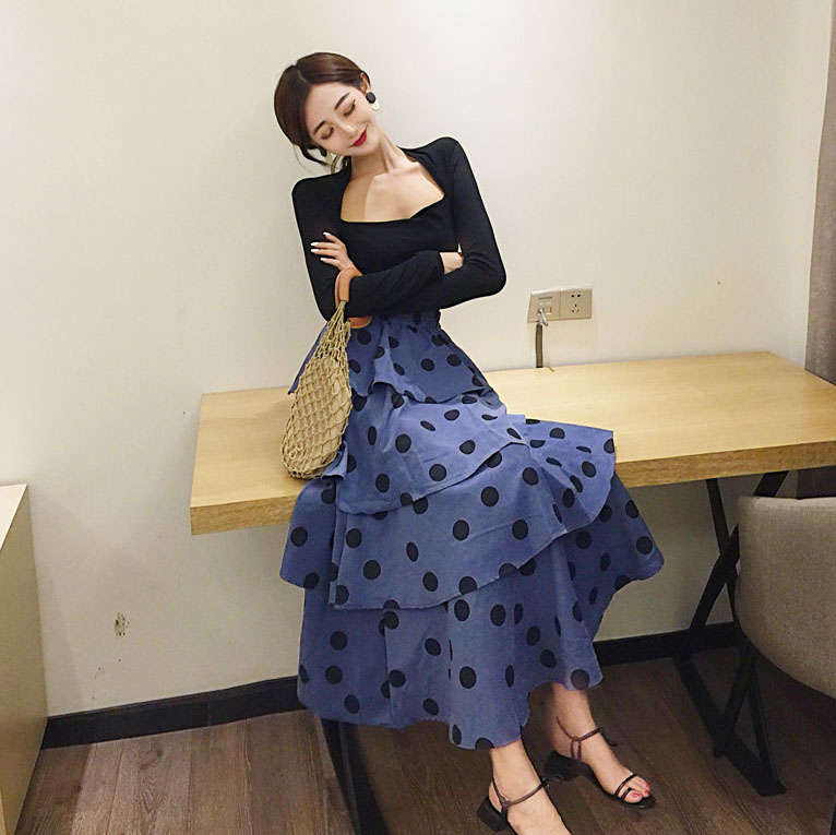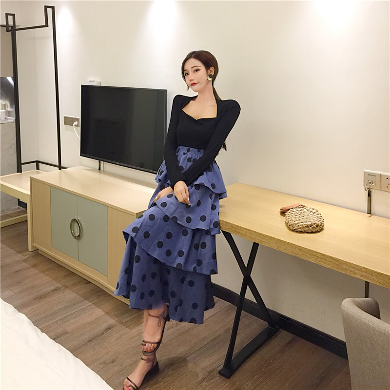 秋裝女2018新款時尚套裝兩件套復古基礎上衣+高腰波點顯瘦蛋糕裙