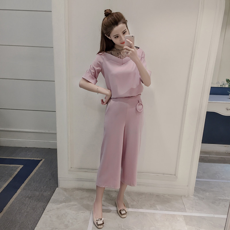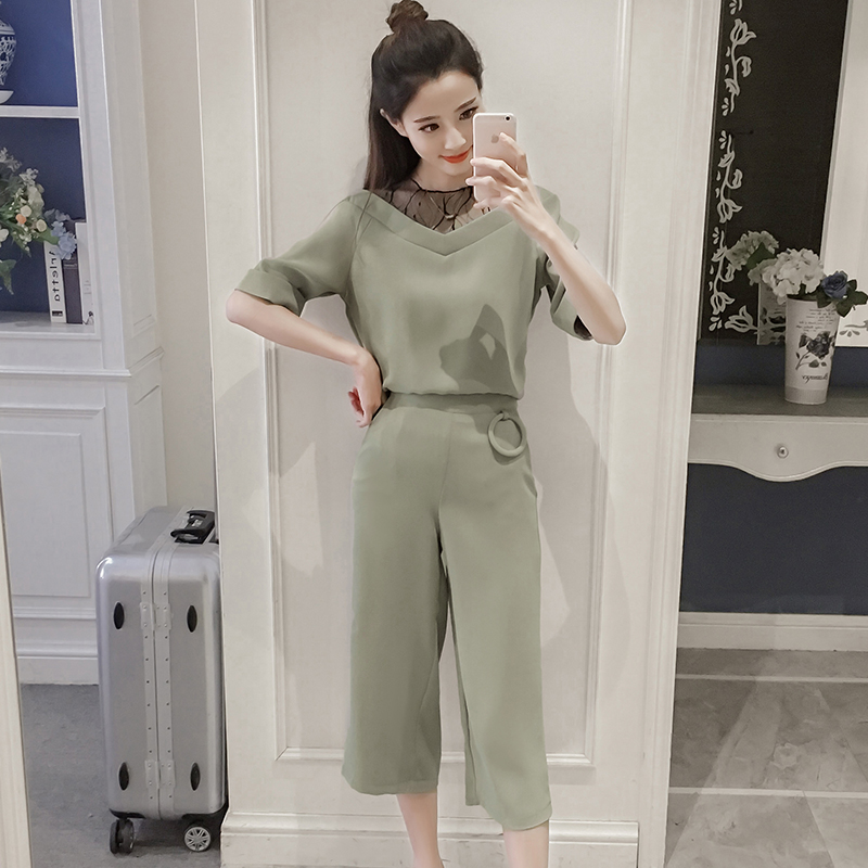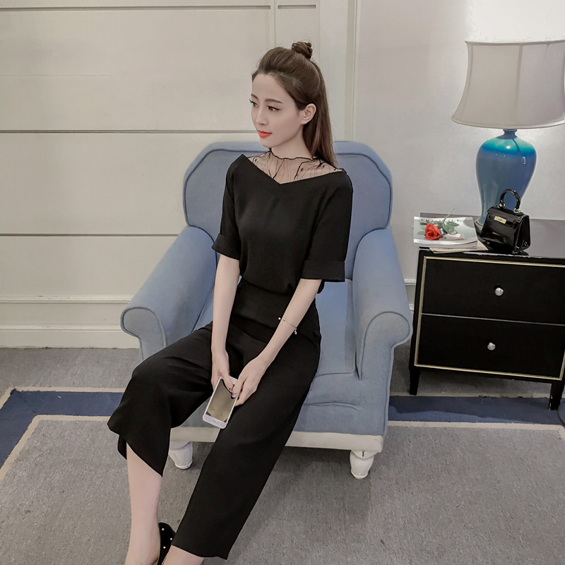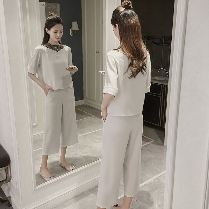 / 春夏季女裝小香風時尚名媛網紗拼接上衣休閑七分闊腿褲兩件套裝潮