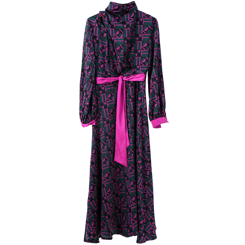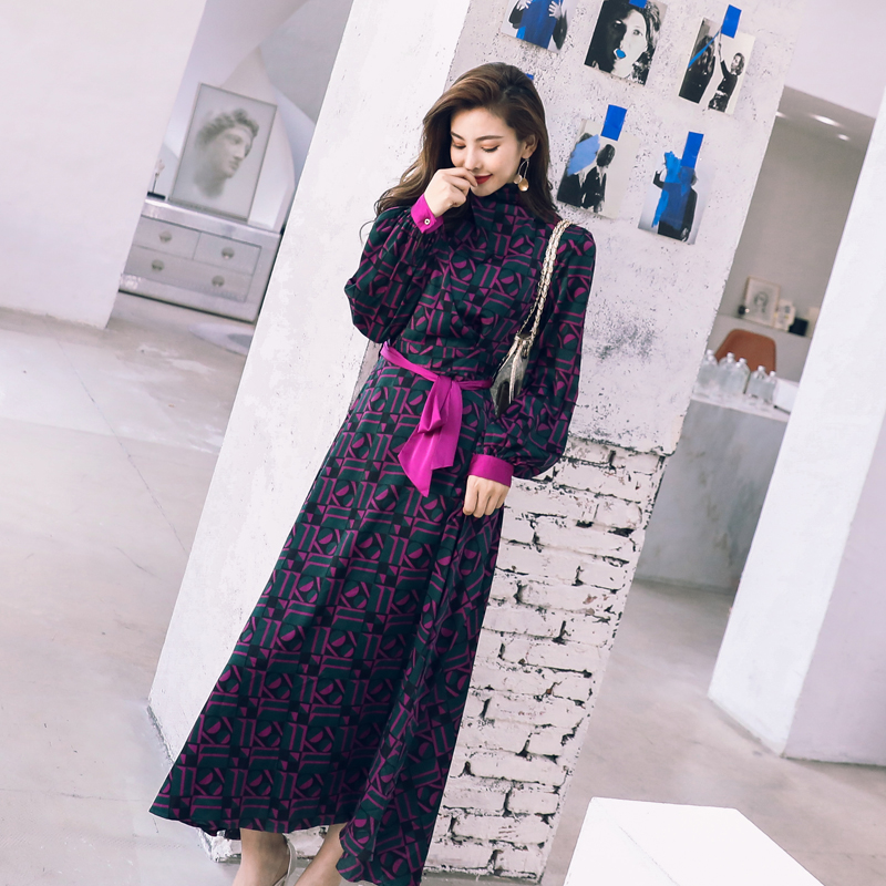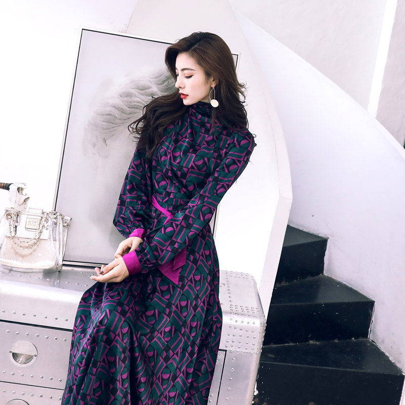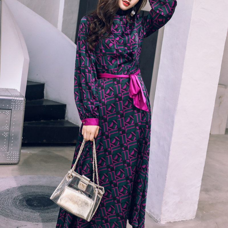 2018早秋新款復古長袖印花連衣裙女中長款收腰遮肚子長袖氣質長裙