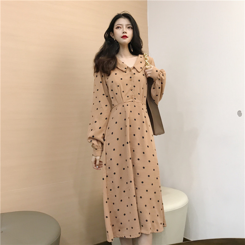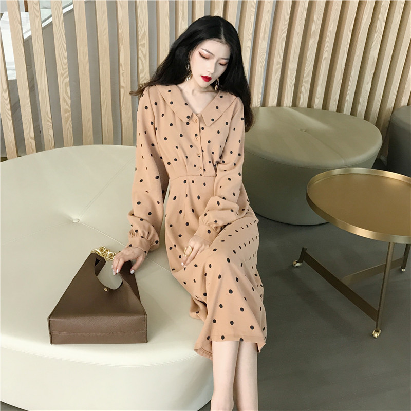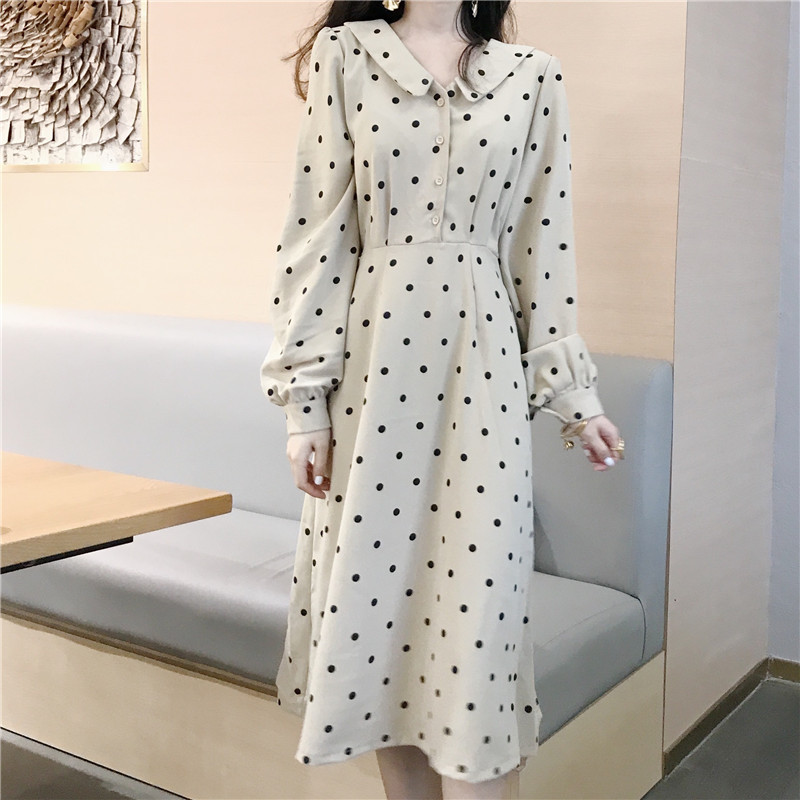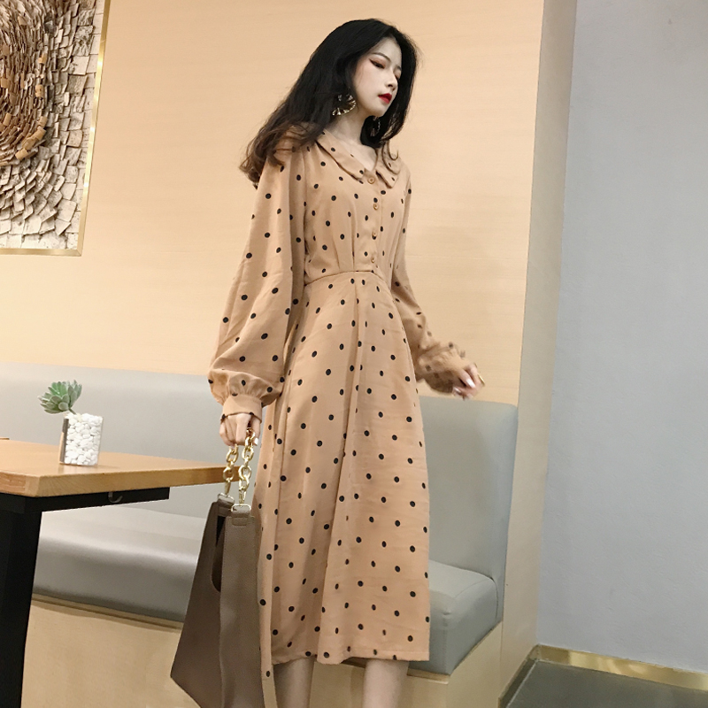 / 2018秋裝時尚晚晚風甜美chic新款娃娃領波點高腰中長裙氣質連衣裙