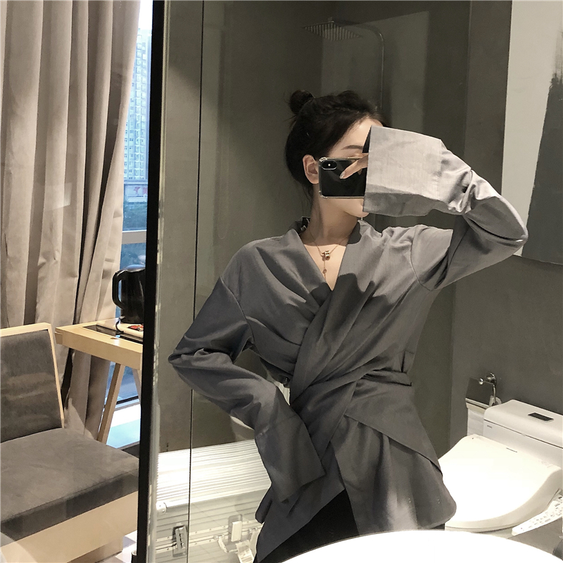 秋裝女復古慵懶風純色系帶收腰V領顯瘦中長款設計感長袖襯衫外套