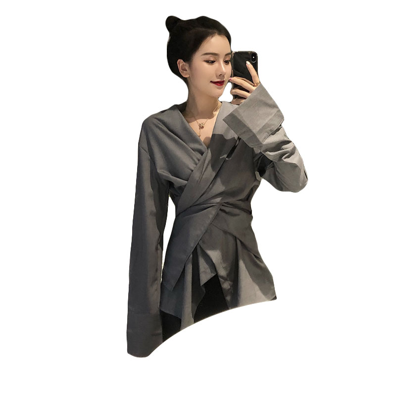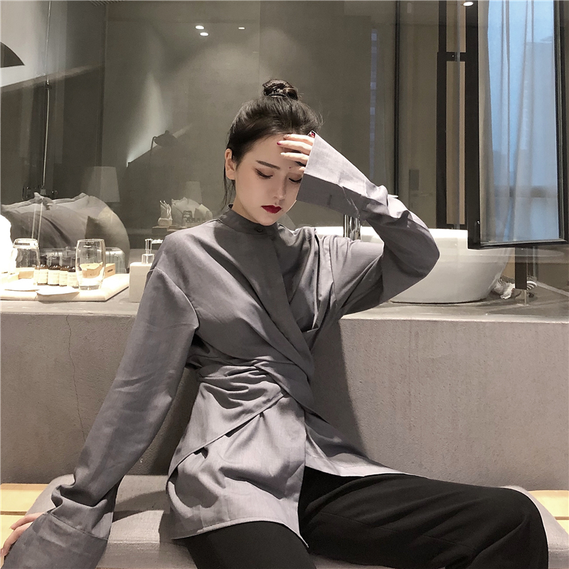 chic早秋上衣慵懶時尚秋裝女2018新款收腰系帶顯瘦喇叭袖上衣T恤