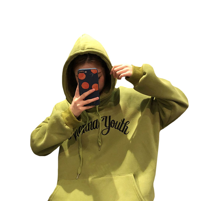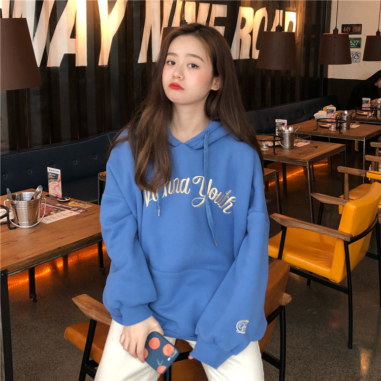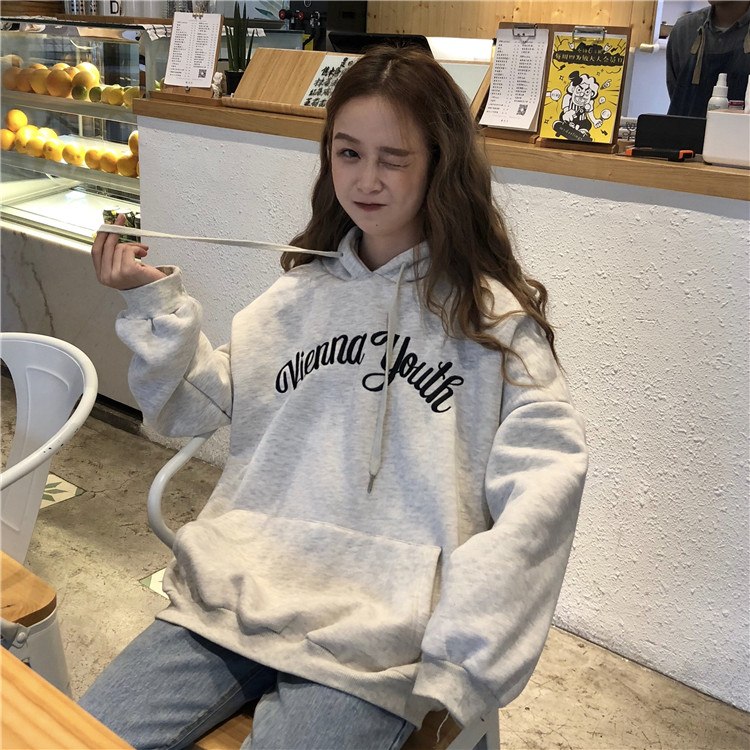 / 秋冬女裝韓版中長款慵懶風寬松加絨加厚字母刺繡連帽衛衣上衣外套