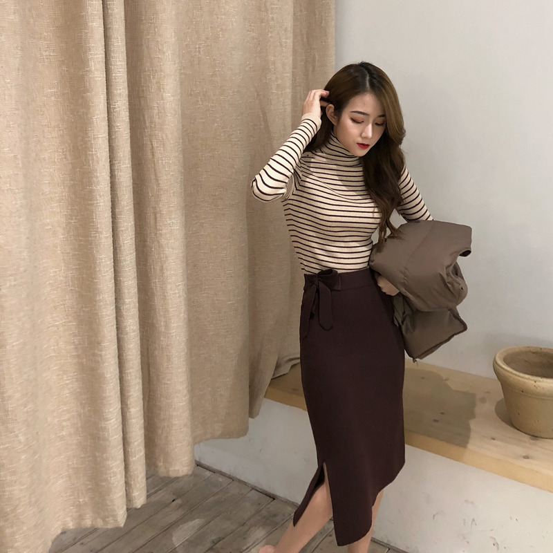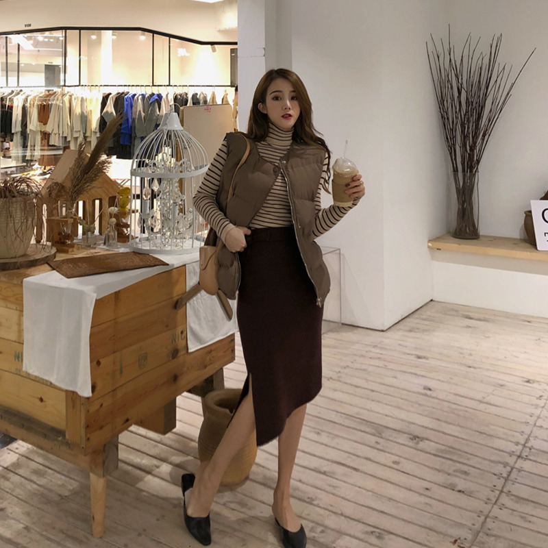 棕色馬夾|黑色馬夾|白色條紋打底|杏色條紋打底|黑色條紋打底|黑色針織裙|棕色針織裙|灰色針織裙