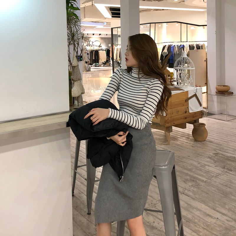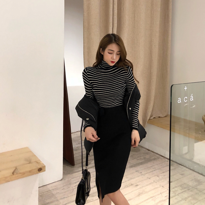 女神套裝秋長袖打底小高領T恤+羊圈毛呢背心馬甲+針織半裙三件套