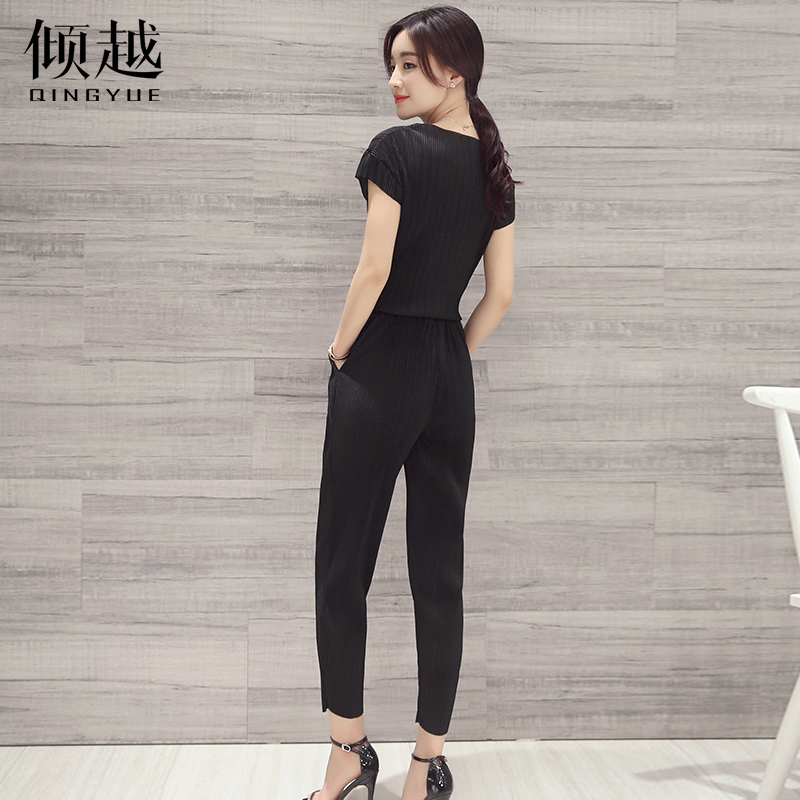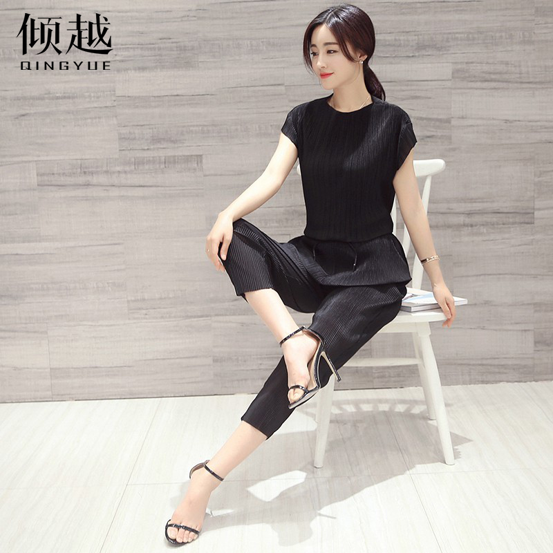 / 傾越2017夏季短袖雪紡衫九分褲休閑套裝寬松顯瘦兩件套夏大碼女裝