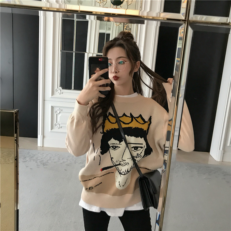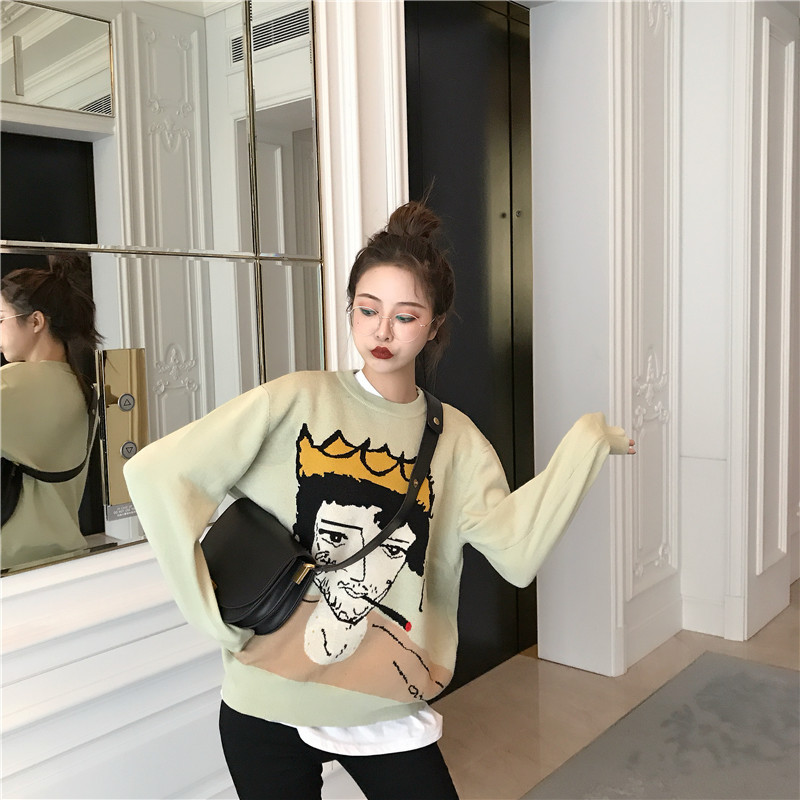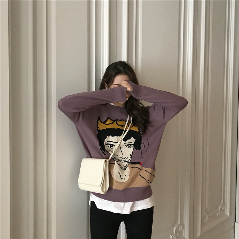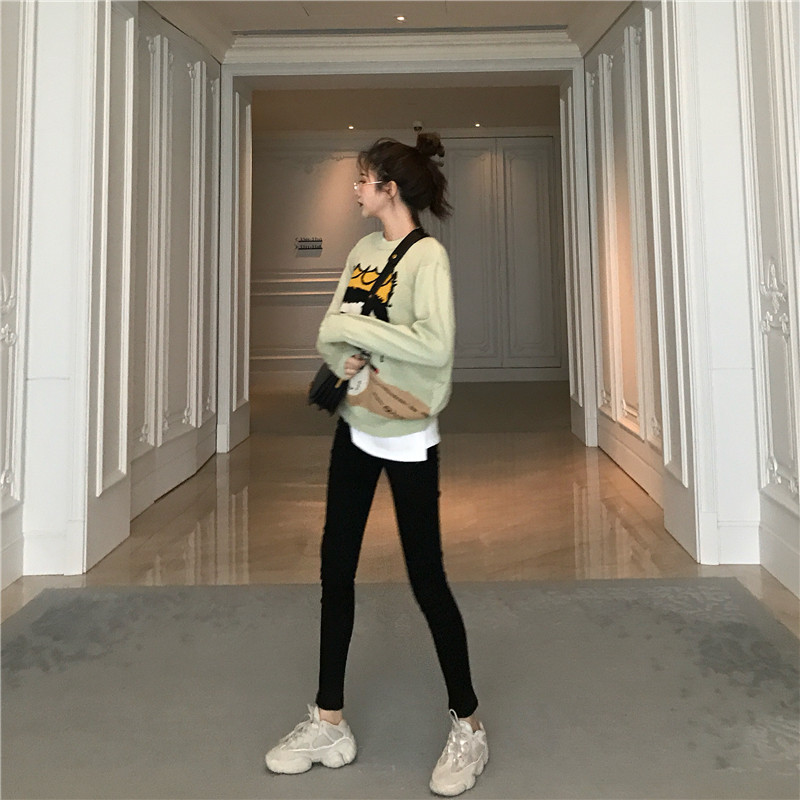 新款人頭圖案圓領套頭休閑毛衣內搭打底衫高腰修身小腳褲時尚套裝