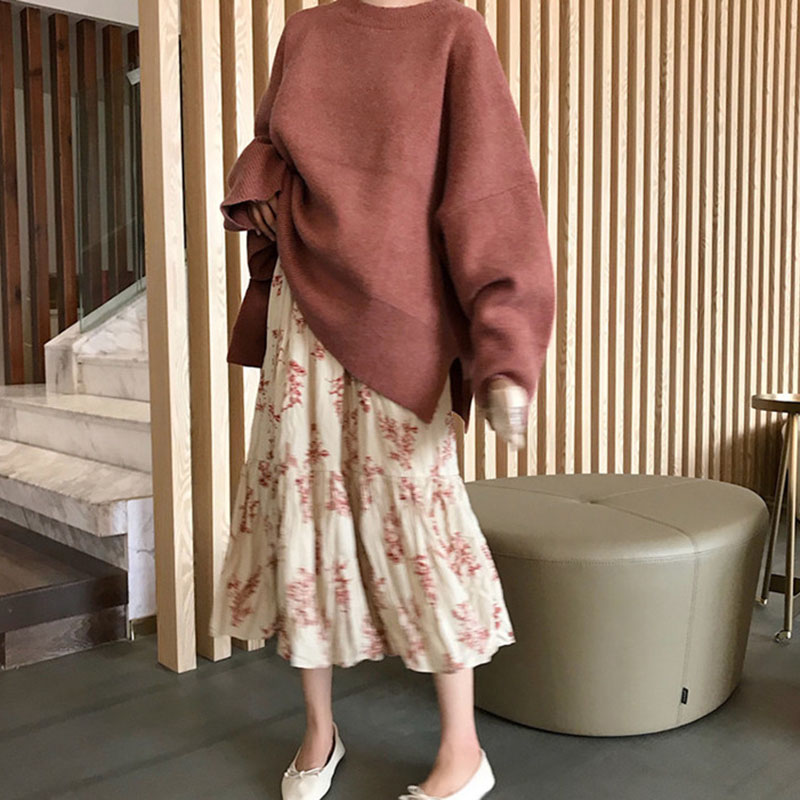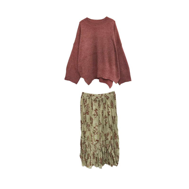 / 套裝女秋2018新款寬松純色套頭毛衣+百搭壓褶碎花半身裙兩件套裝