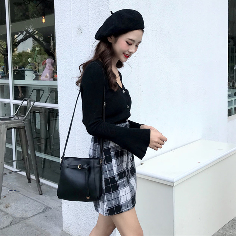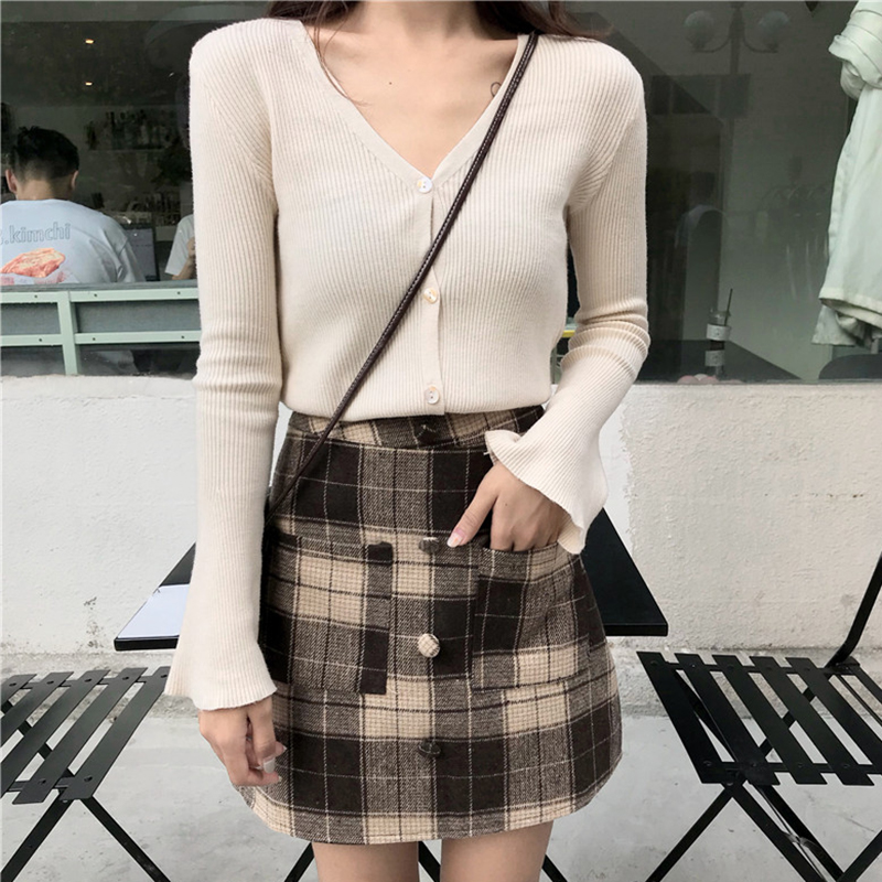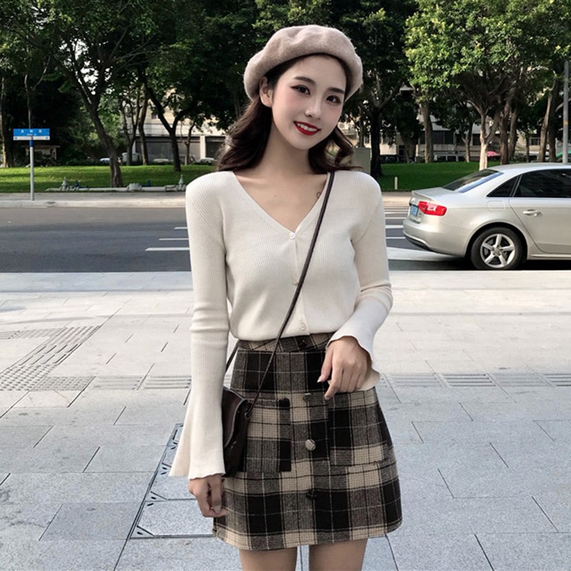 小香風套裝女秋2018新款喇叭長袖針織開衫高腰格子半身A字短裙子