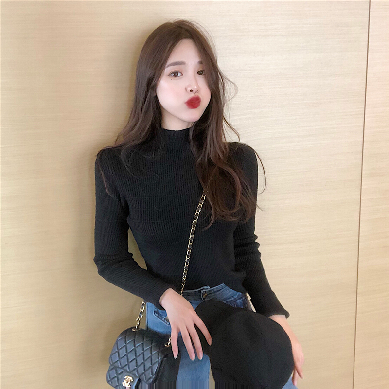 韓版chic早秋毛衣慵懶風氣質半高領圓環拉鏈修身長袖打底針織衫潮