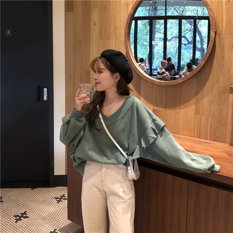 / 秋季韓版chic復古純色V領BF風寬松荷葉邊套頭超火衛衣上衣外套女