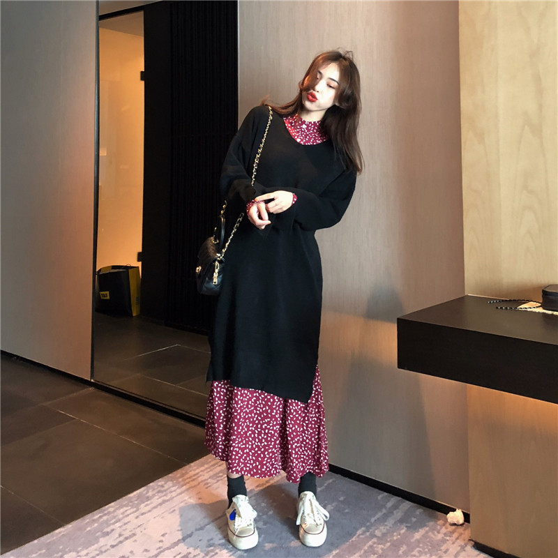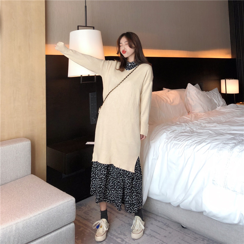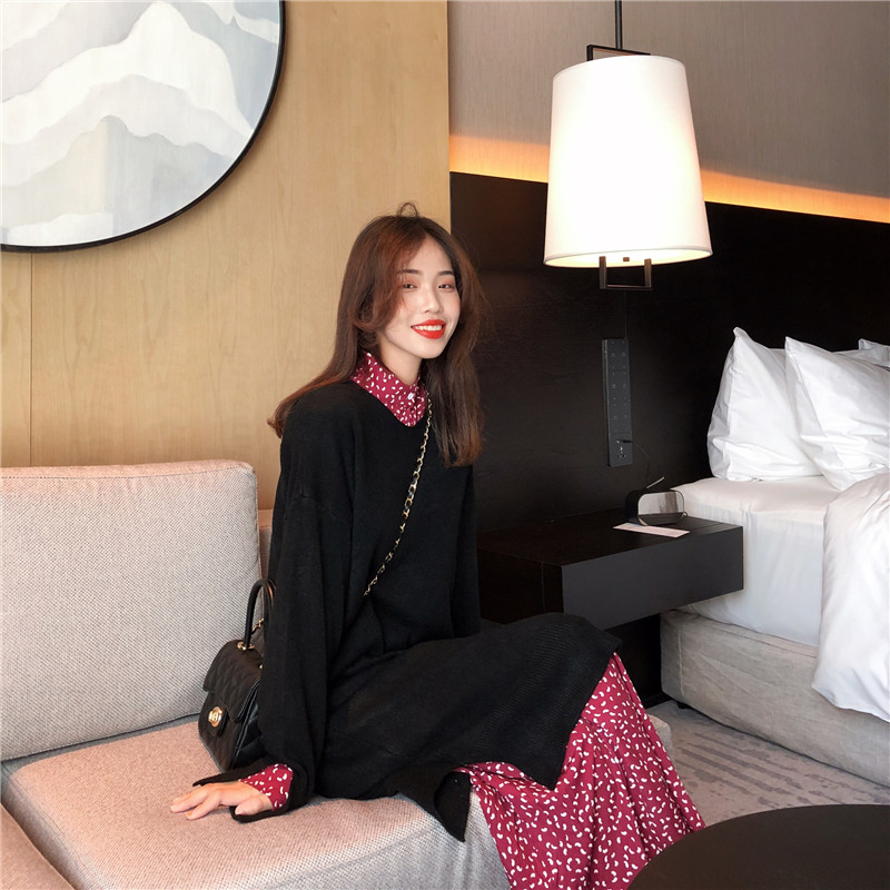 秋冬韓版新款中長款毛絨針織馬甲+氣質系帶雪紡連衣裙時尚兩件套