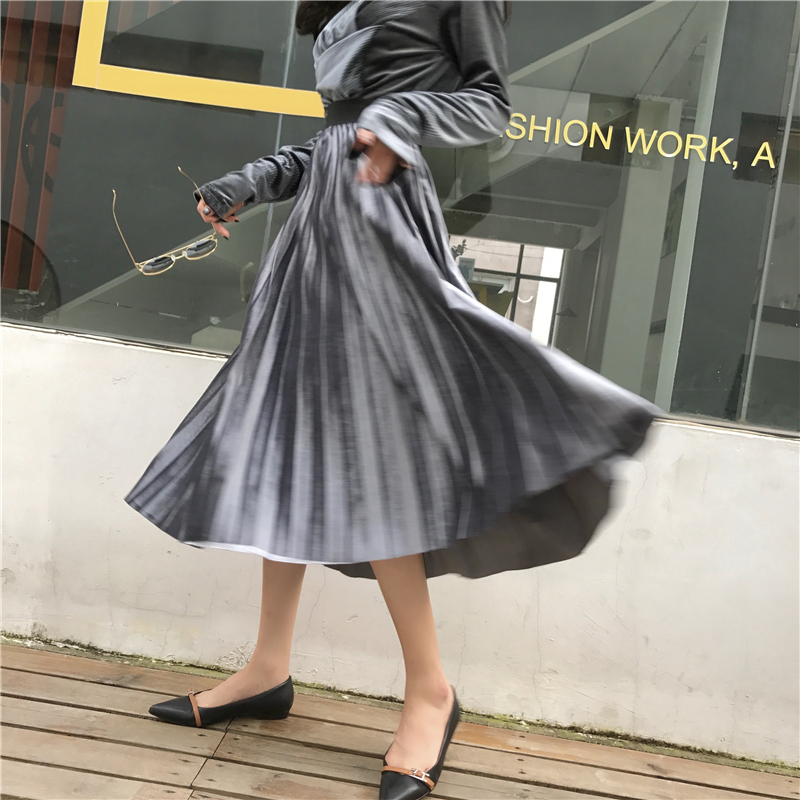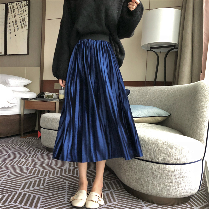 裙子女2018秋天復古港味中長款時尚修身百搭絲絨壓褶松緊腰半身裙