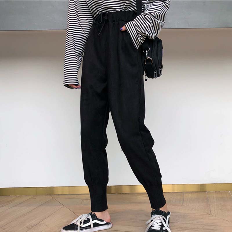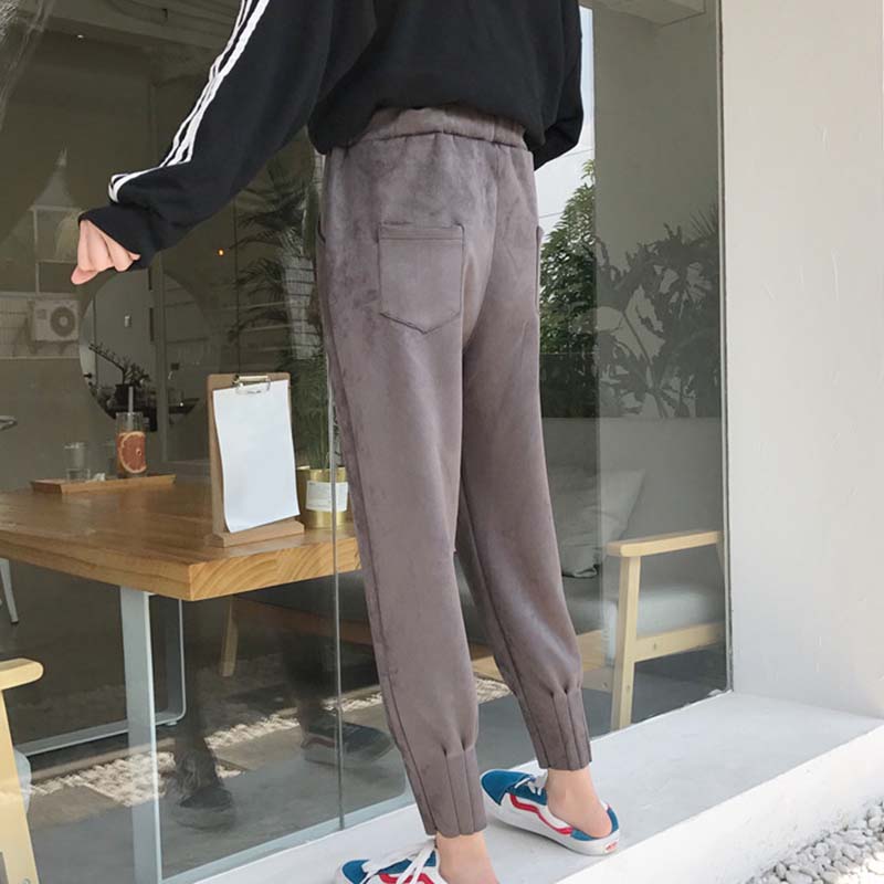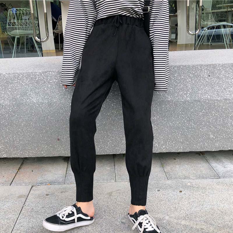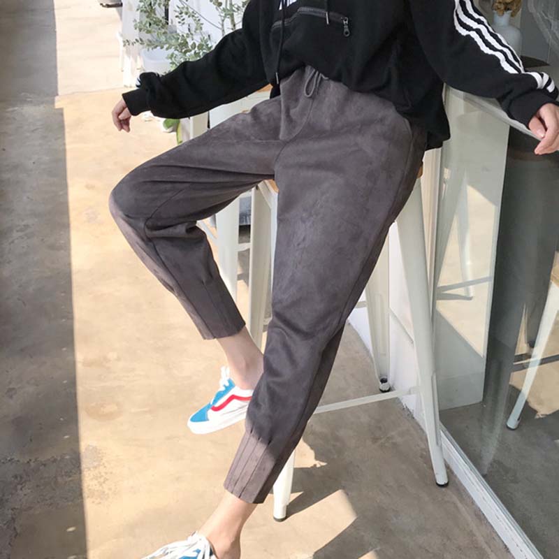 / 秋冬女裝2018新款韓版麂皮絨寬松哈倫褲系帶高腰顯瘦休閑九分褲子