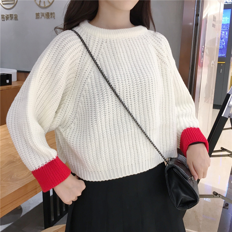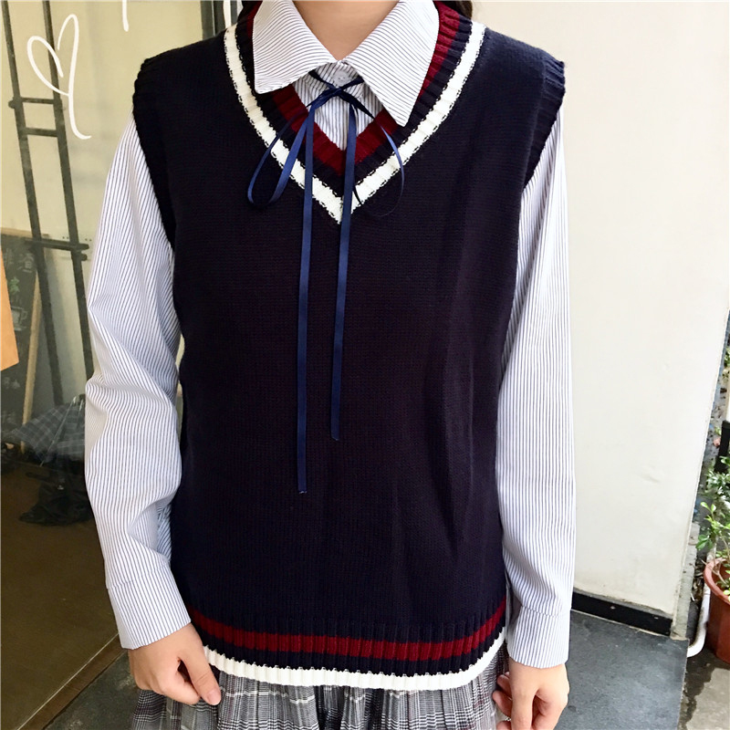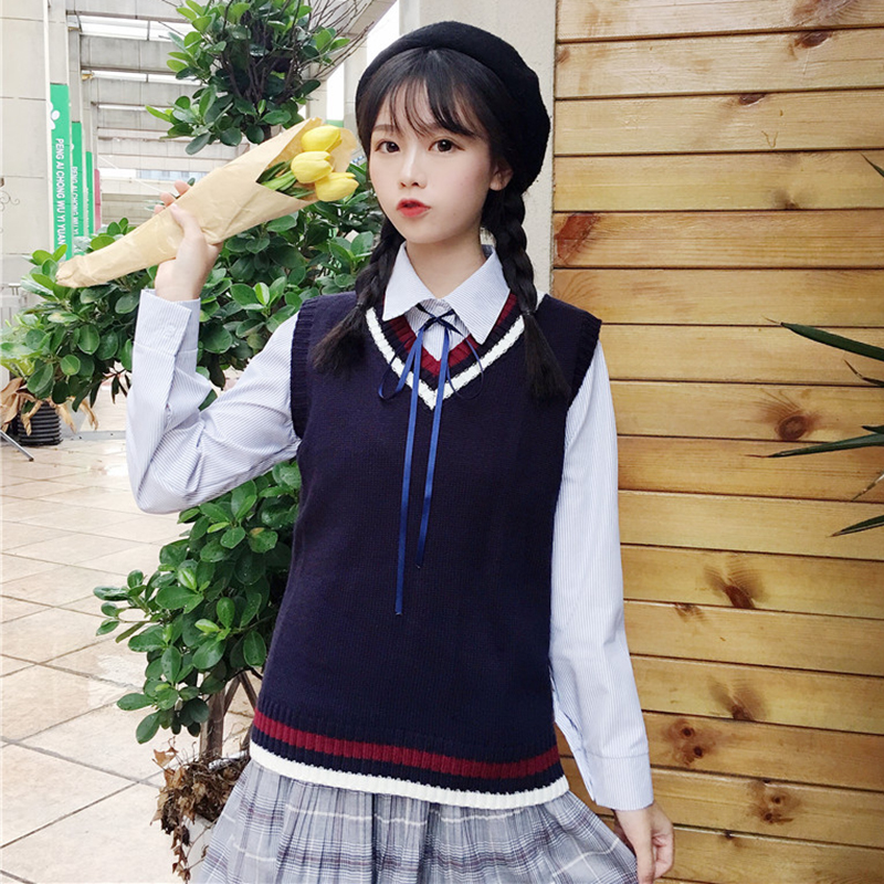 / 女冬裝新款韓版學生百搭條紋長袖襯衣時尚寬松V領針織馬甲兩件套