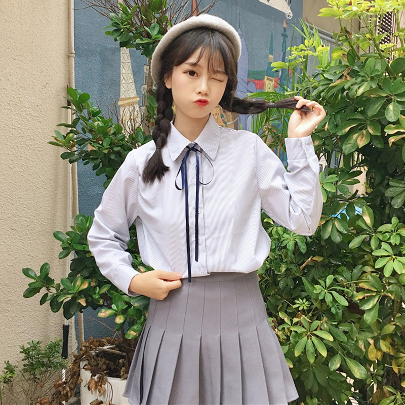 女冬裝新款韓版學生百搭條紋長袖襯衣時尚寬松V領針織馬甲兩件套