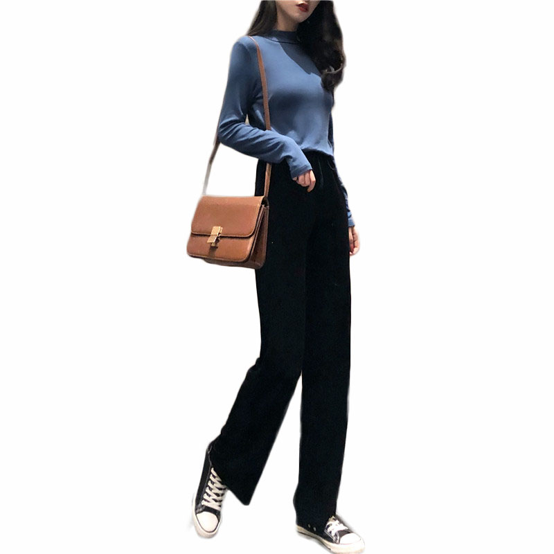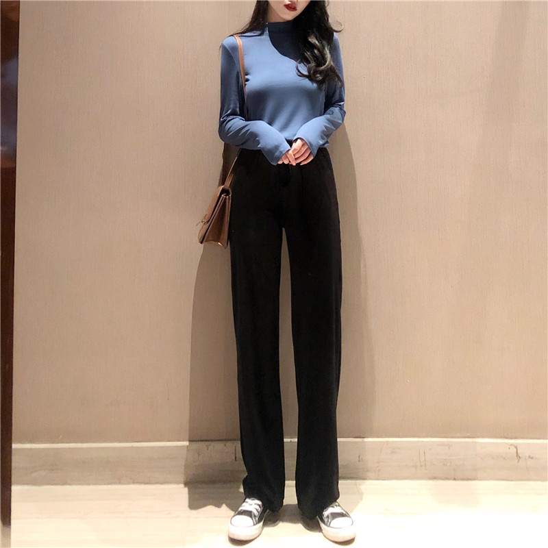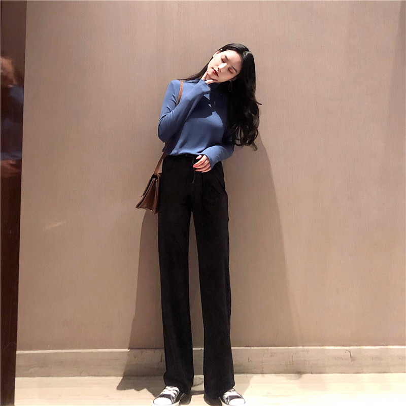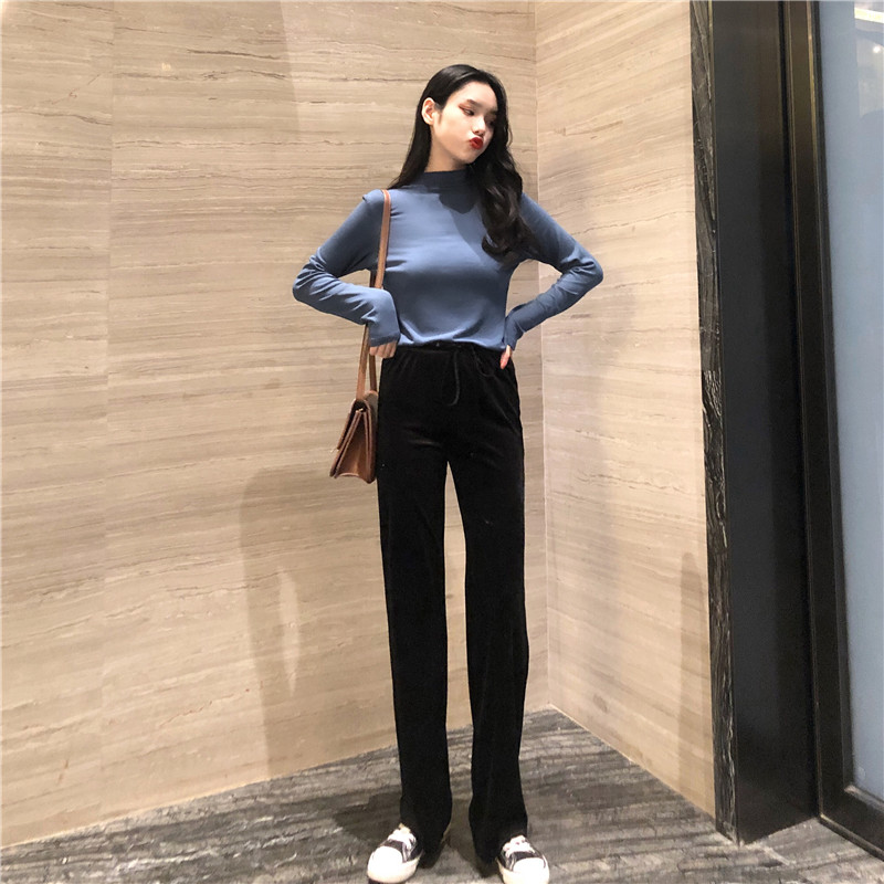 韓國復古風女神套裝修身顯瘦純色打底衫女+高腰直筒金絲絨闊腿褲