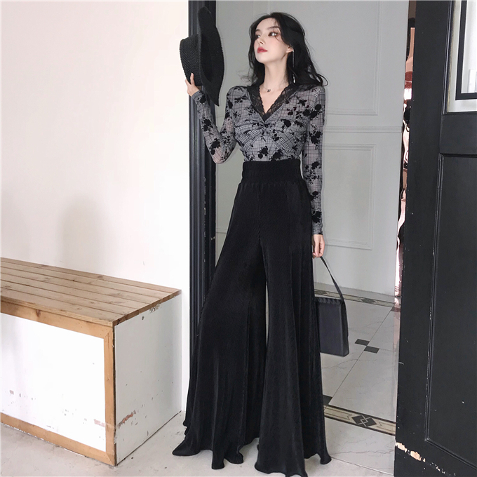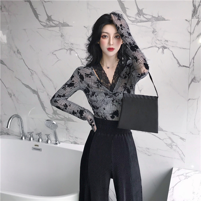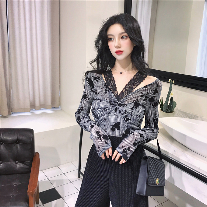 港味格子植絨掛脖蕾絲交叉v領打底T恤女+厚款高腰垂感喇叭褲套裝