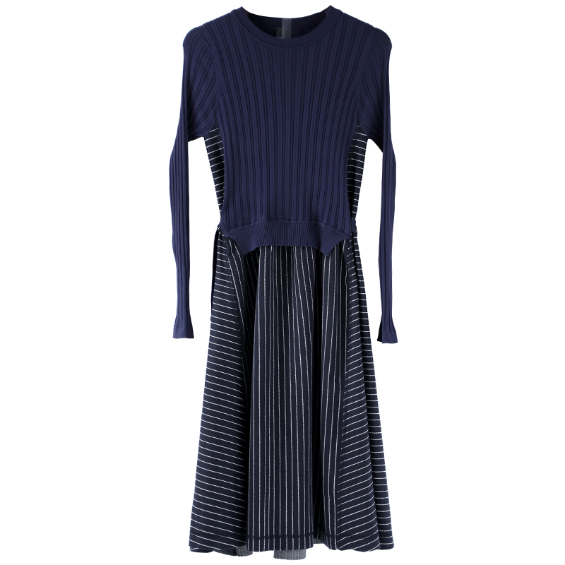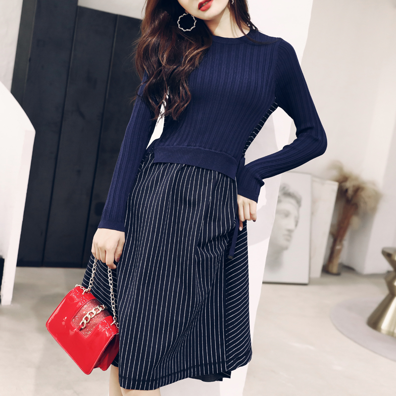 名媛2018秋季新款長袖打底裙韓版女假兩件中長款拼接針織連衣裙潮