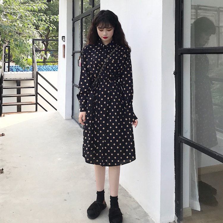 慵懶風長款兩穿針織開衫馬甲外套波點襯衣連衣裙女時尚套裝兩件套