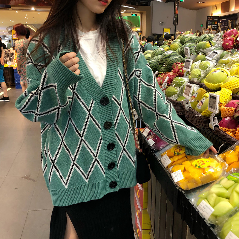 / 秋冬2018新款韓版慵懶風菱格寬松中長款網紅針織衫毛衣開衫外套女
