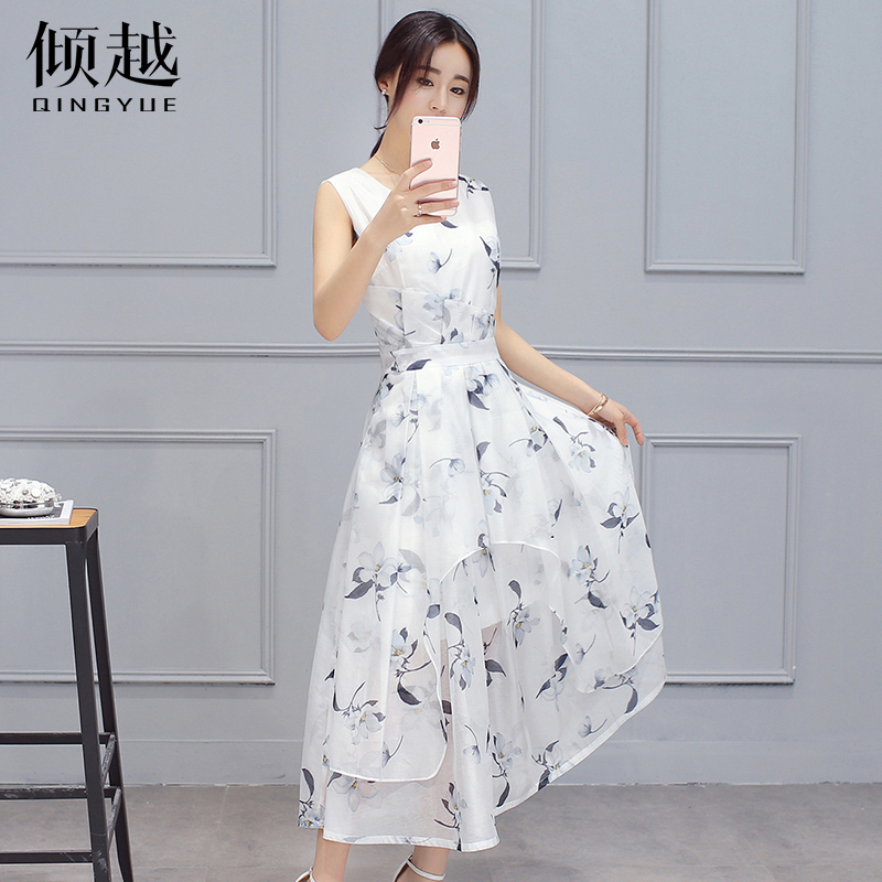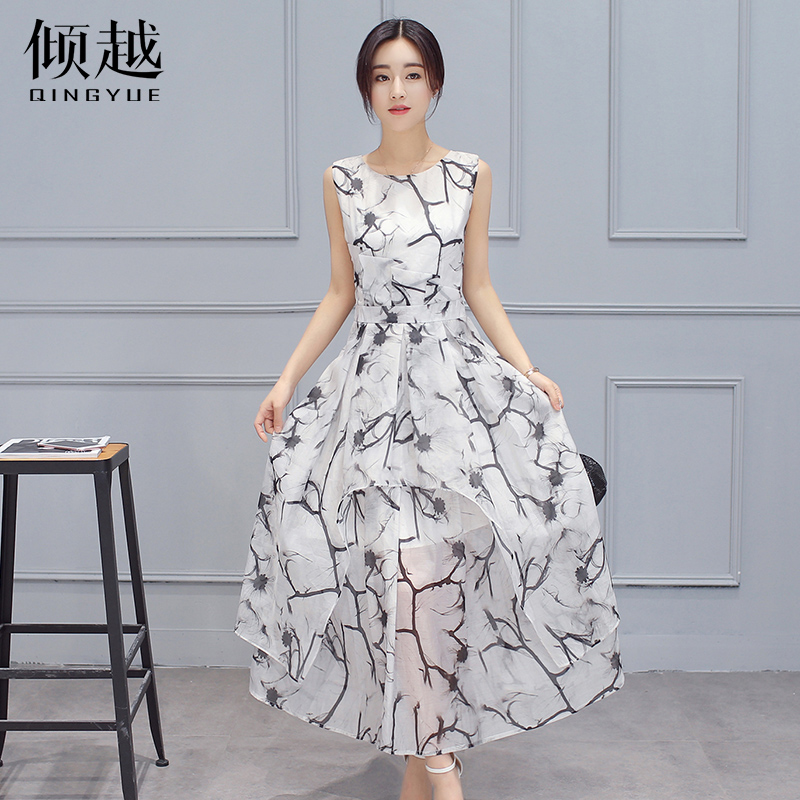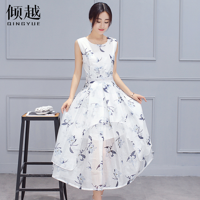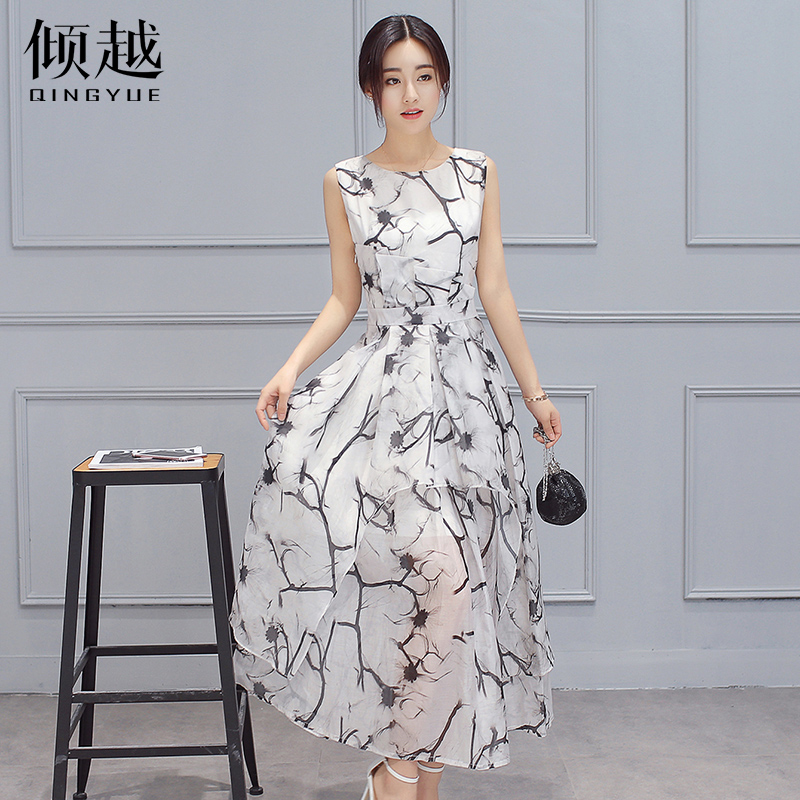/ 2017夏新款女裝歐根紗印花無袖連衣裙收腰修身氣質淑女蓬蓬裙子潮