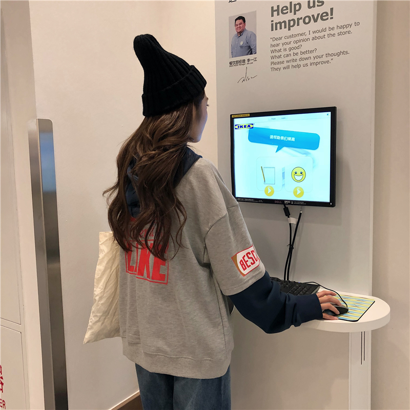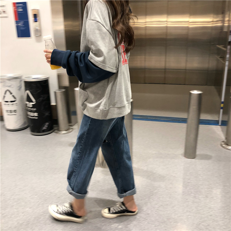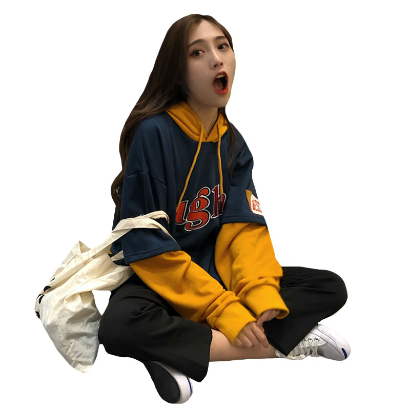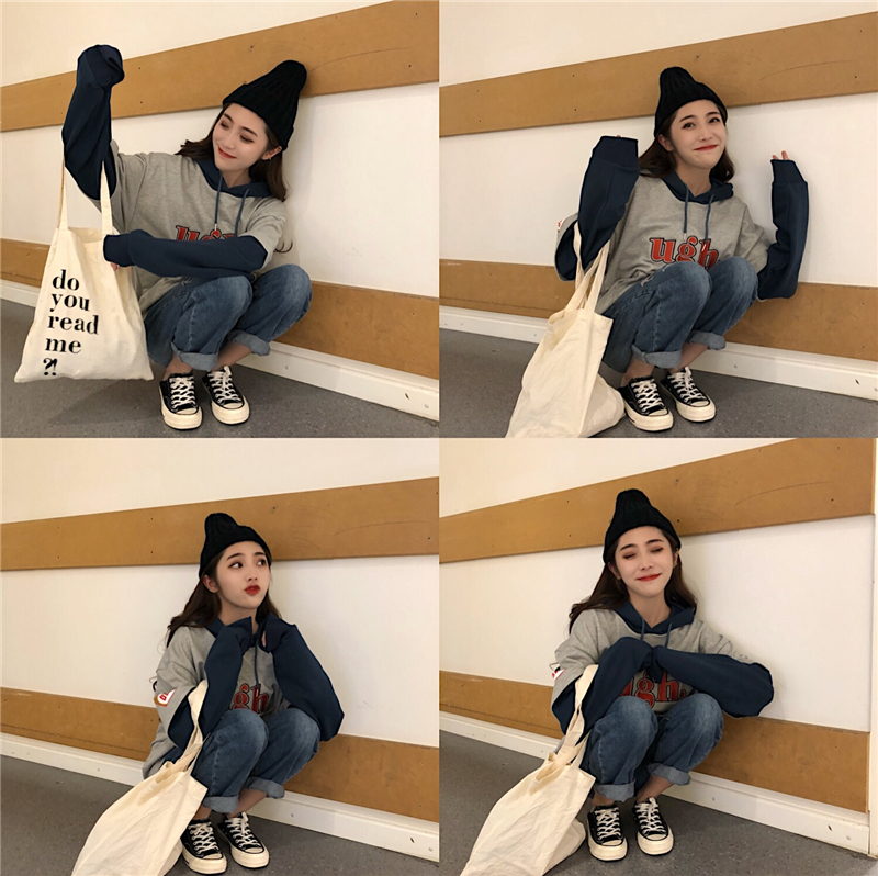 / 秋季女裝韓版中長款原宿風字母拼接寬松連帽套頭超火衛衣上衣外套