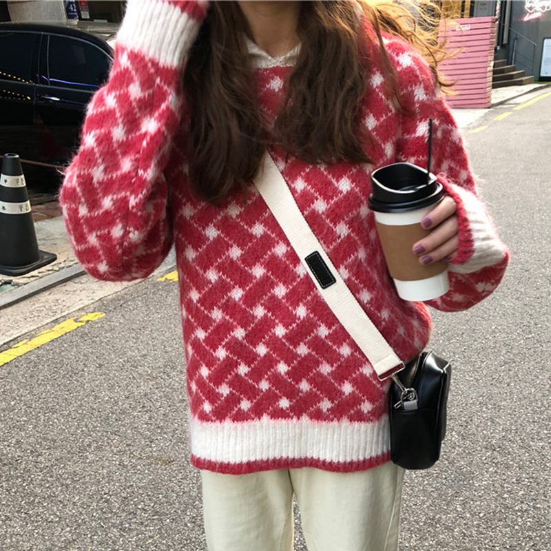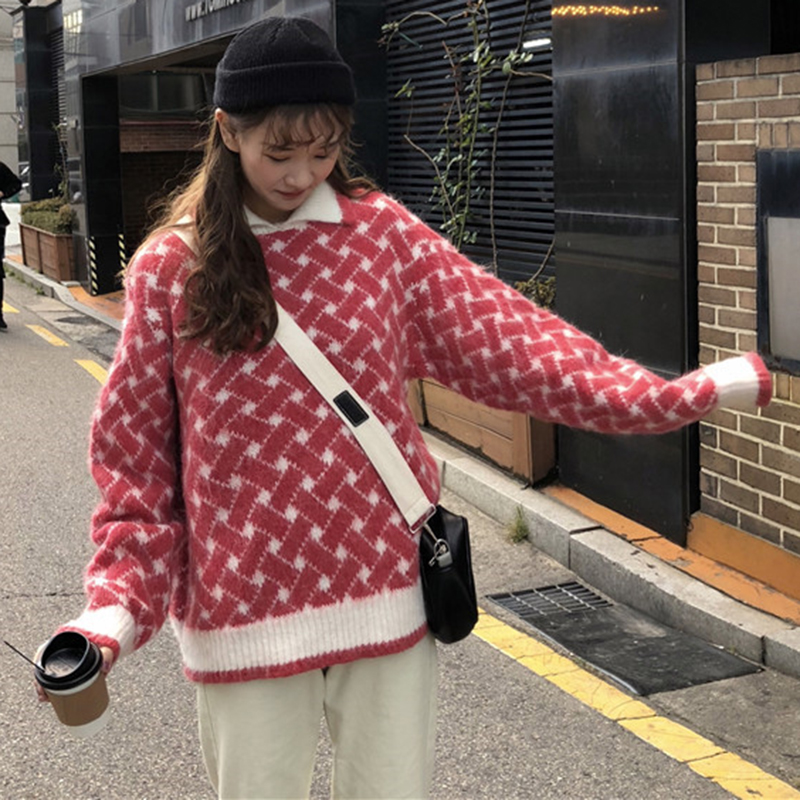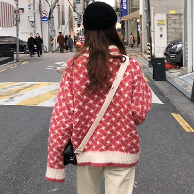 翻領慵懶毛衣女秋冬裝2018新款學生復古格紋針織外套休閑長袖上衣