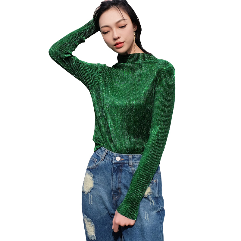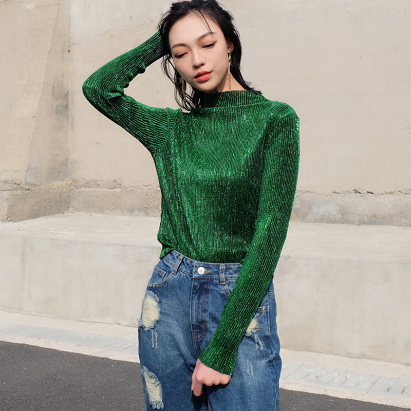 / 早秋新款韓版女裝修身閃閃亮片長袖T恤上衣顯瘦金屬半高領打底衫