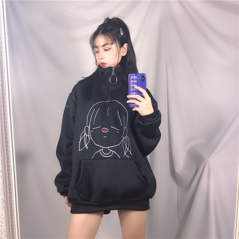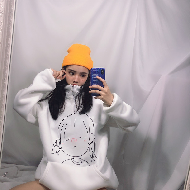 2018新款秋冬韓版中長款寬松卡通立領加絨加厚超火衛衣上衣外套女