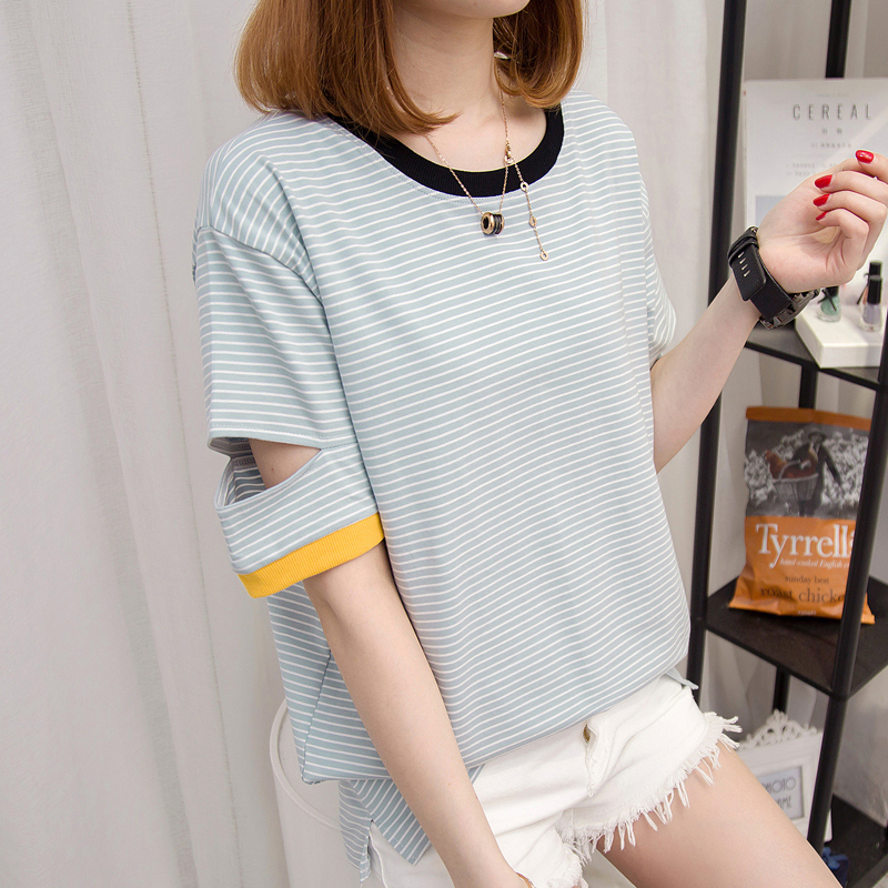 / 短袖上衣女夏新款t恤中長袖韓版寬松破洞打底條紋體恤衫百搭