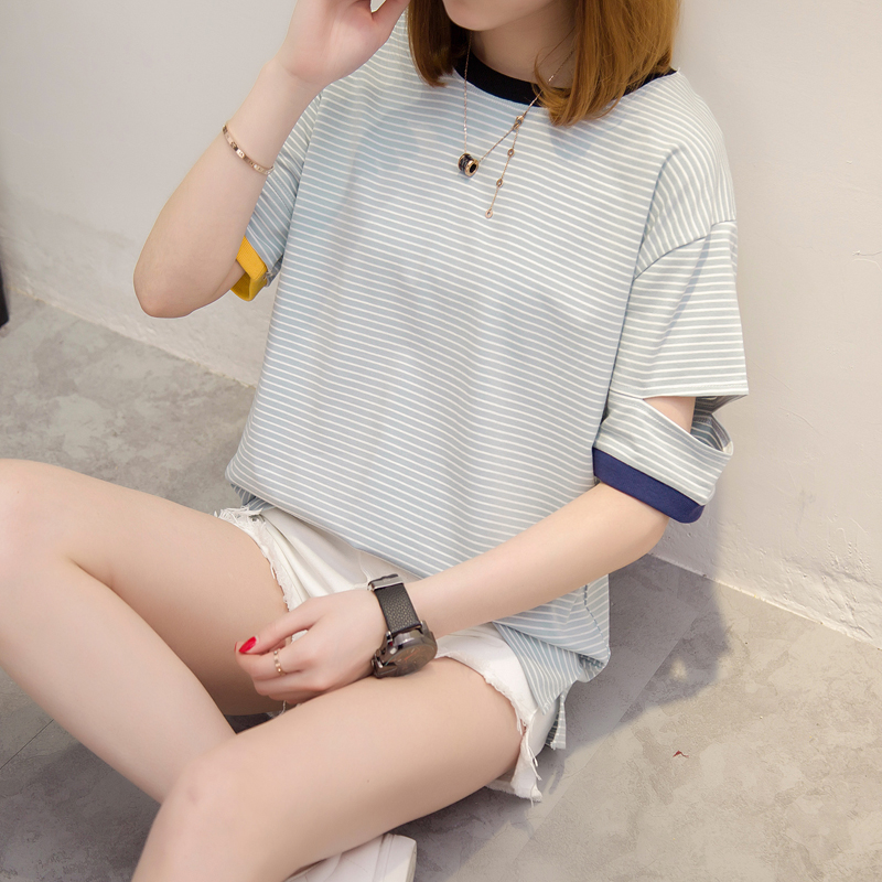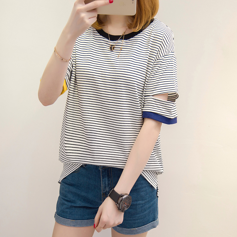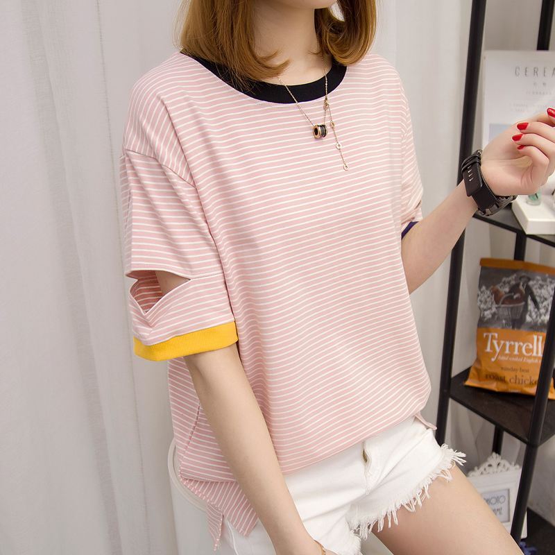 短袖上衣女夏新款t恤中長袖韓版寬松破洞打底條紋體恤衫百搭