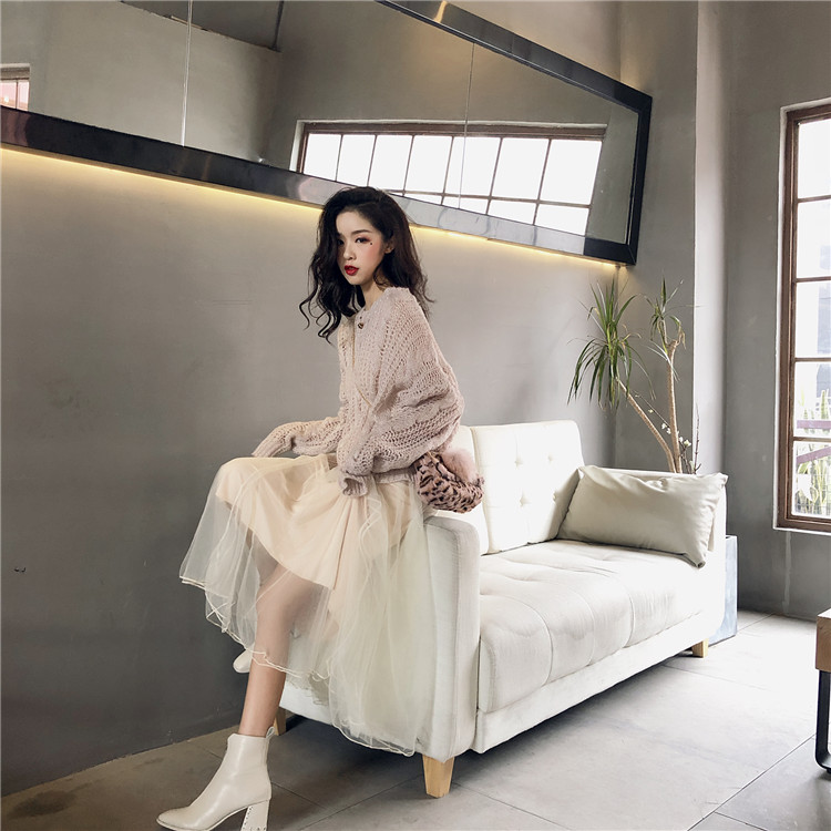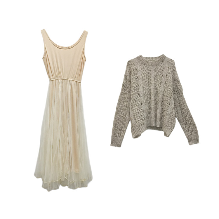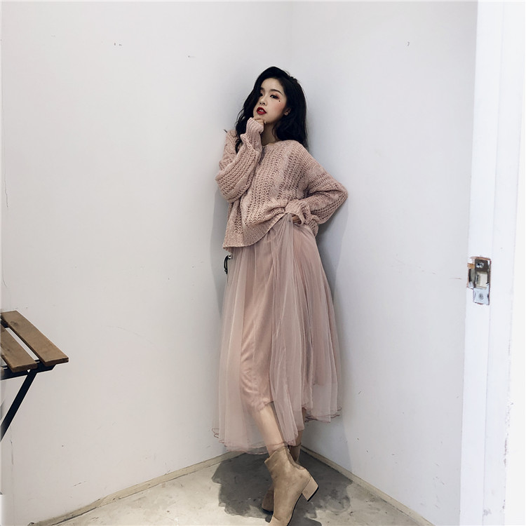 / 秋季溫柔仙女麻花慵懶寬松網紅毛衣+背心連衣蓬蓬紗裙半身裙套裝