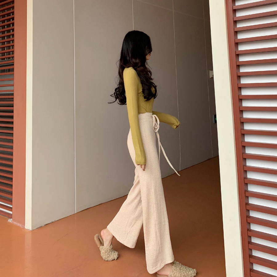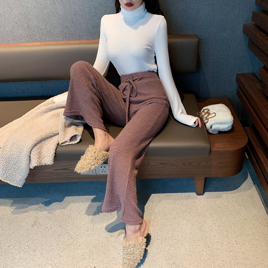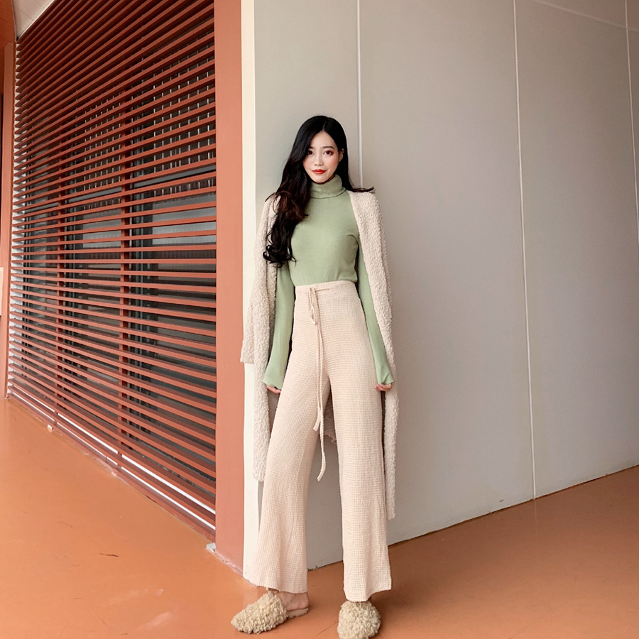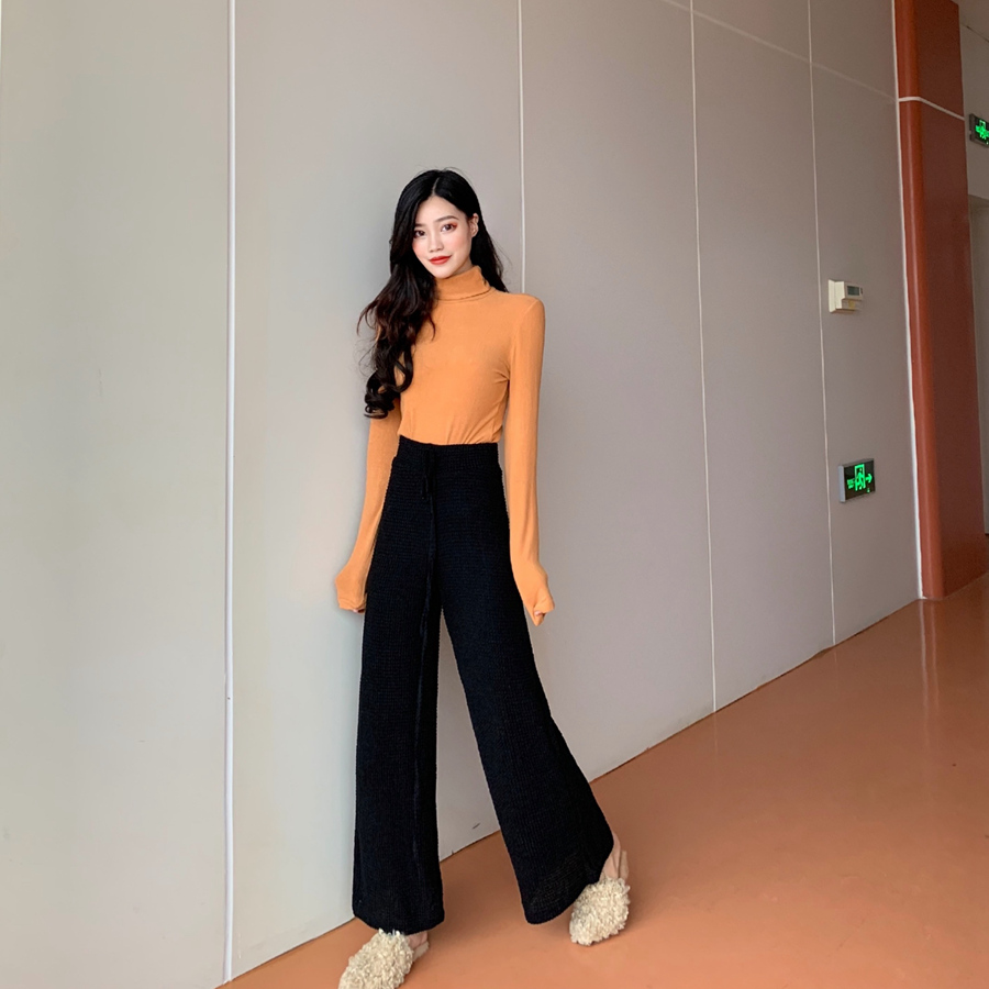 復古韓國chic風加厚高領修身磨毛水果色打底衫+高腰闊腿針織長褲