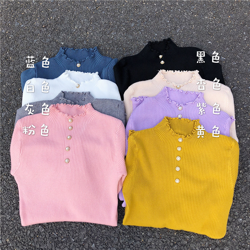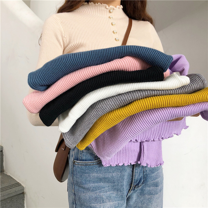 2018新款秋冬女裝韓版純色修身木耳邊套頭網紅打底針織衫毛衣上衣