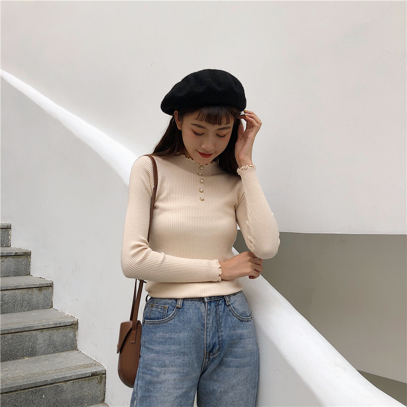 / 2018新款秋冬女裝韓版純色修身木耳邊套頭網紅打底針織衫毛衣上衣