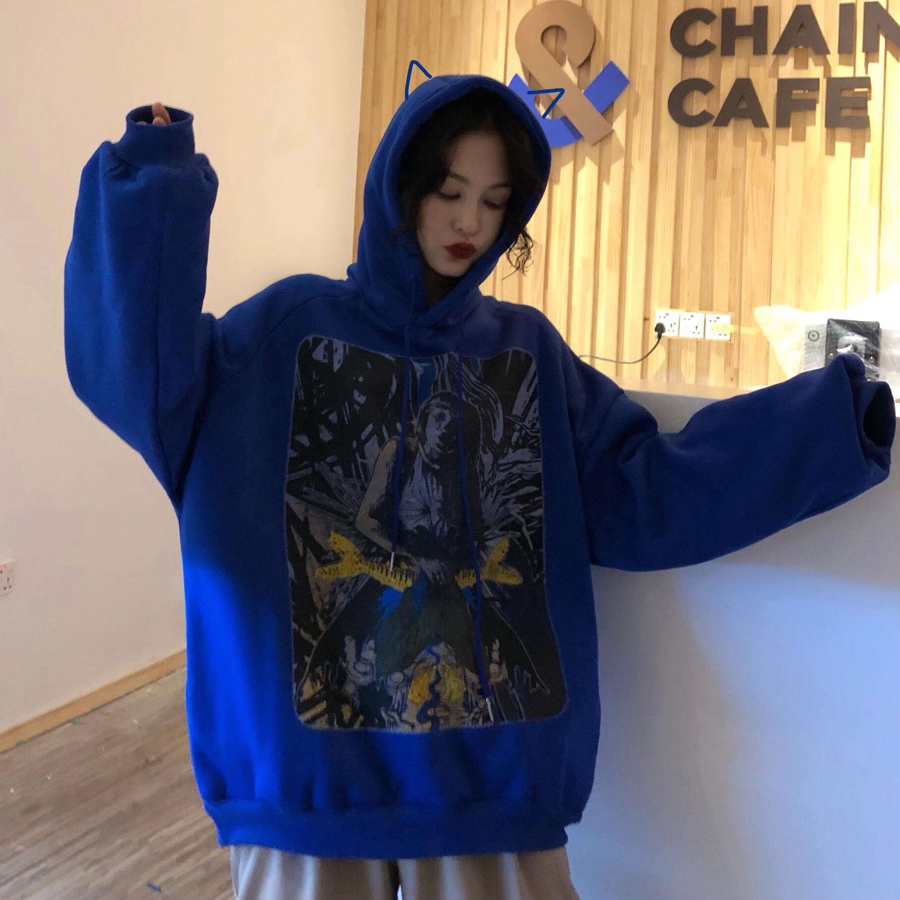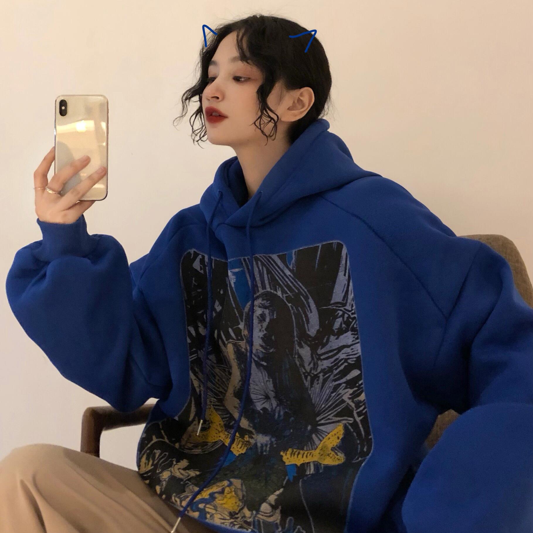 秋冬韓版中長款慵懶風寬松原宿風涂鴉加絨加厚連帽衛衣上衣外套女