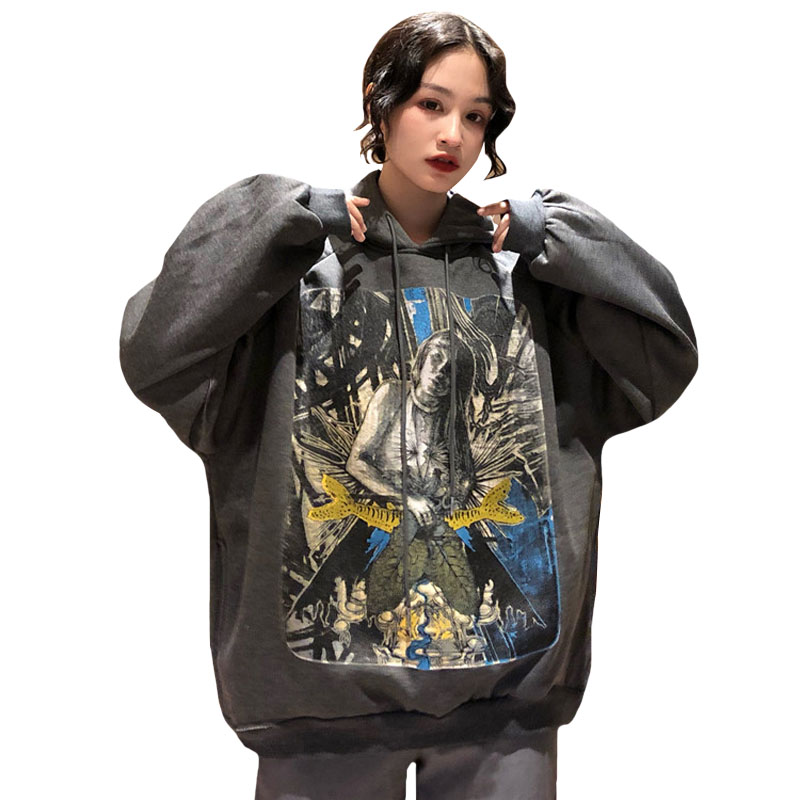 / 秋冬韓版中長款慵懶風寬松原宿風涂鴉加絨加厚連帽衛衣上衣外套女