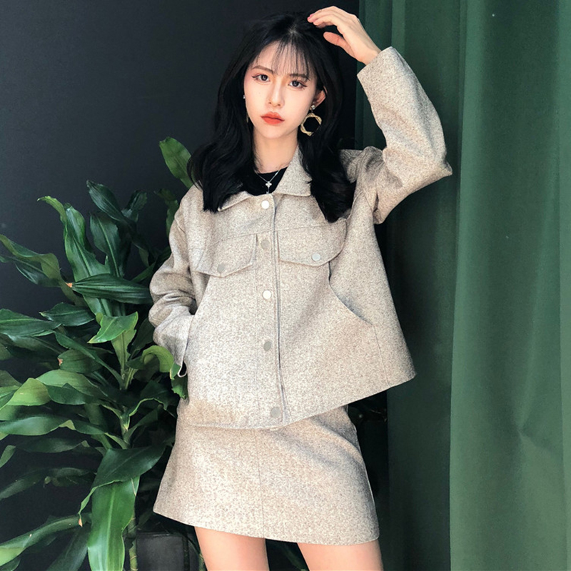 御姐套裝女秋冬新款寬松長袖短外套高腰顯瘦短裙子純色休閑直筒褲