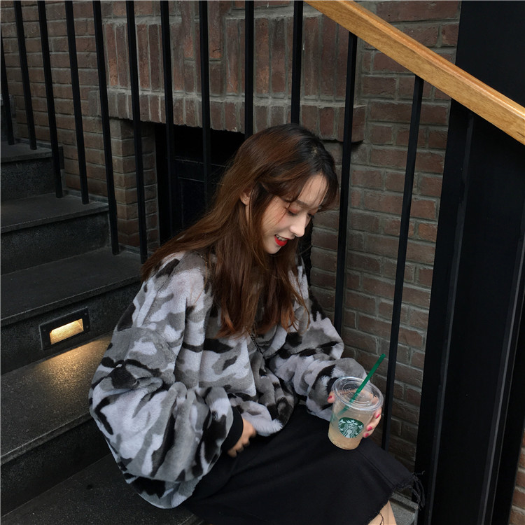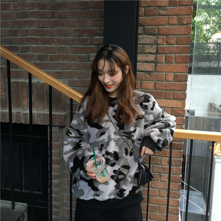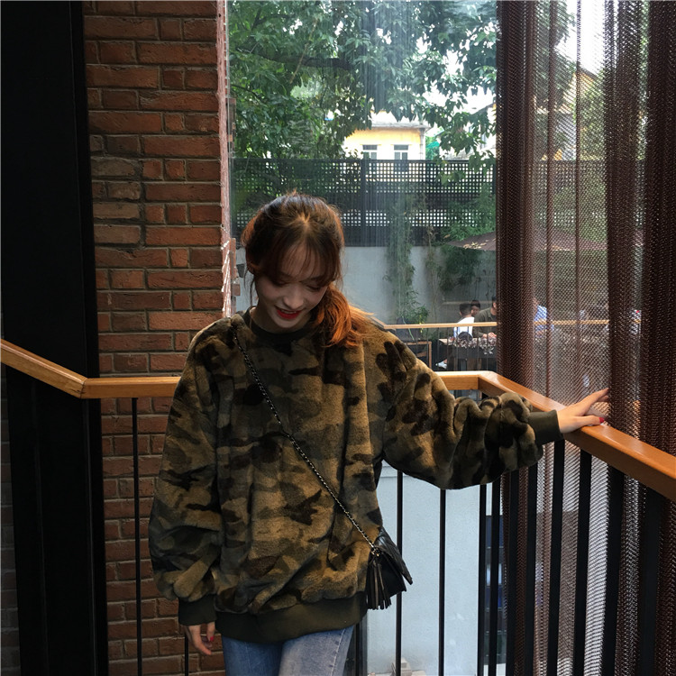 2018新款秋冬韓版原宿風迷彩寬松毛絨加厚套頭超火衛衣上衣外套女