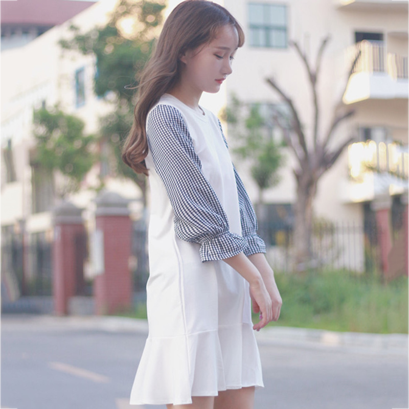 早秋2018新款女裝韓版格子拼接喇叭袖連衣裙學生休閑荷葉邊短裙子