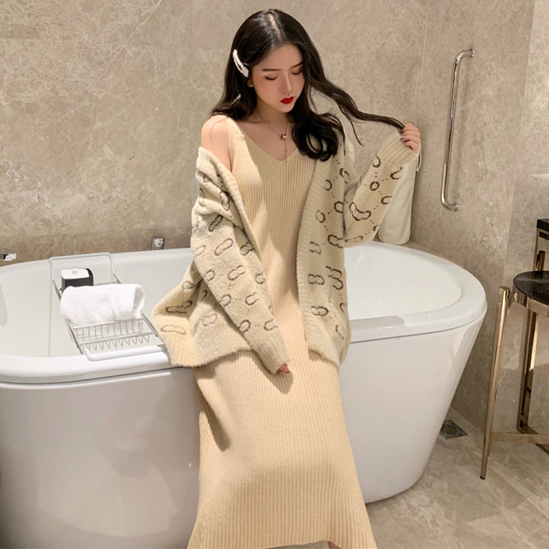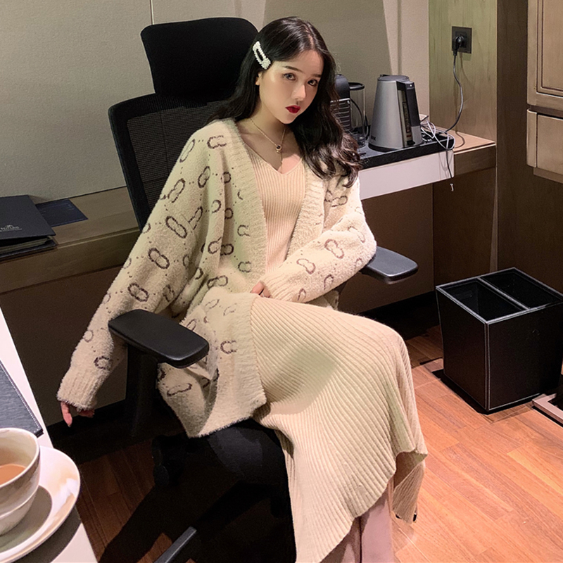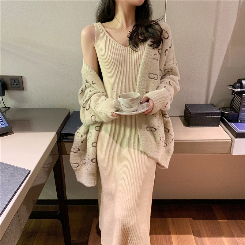 / 時尚套裝女秋冬新款慵懶風長袖毛衣外套氣質A字針織V領背心長裙子