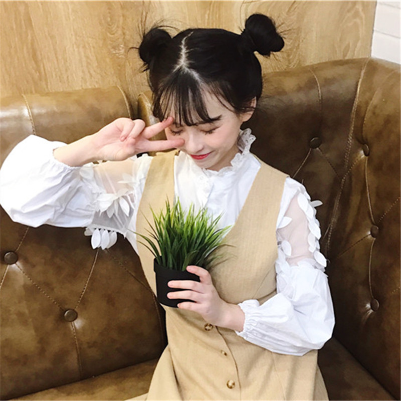/ 早秋新款女裝甜美立領網紗拼接寬松顯瘦樹葉花燈籠袖學生襯衫上衣