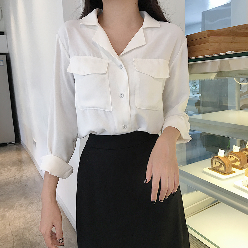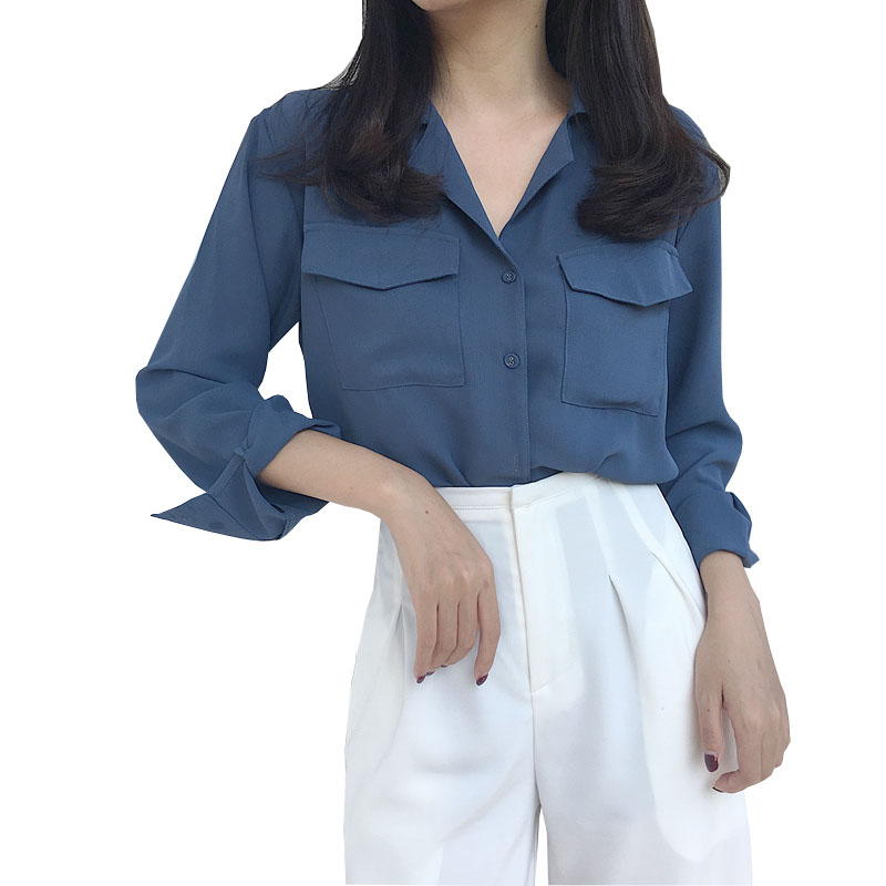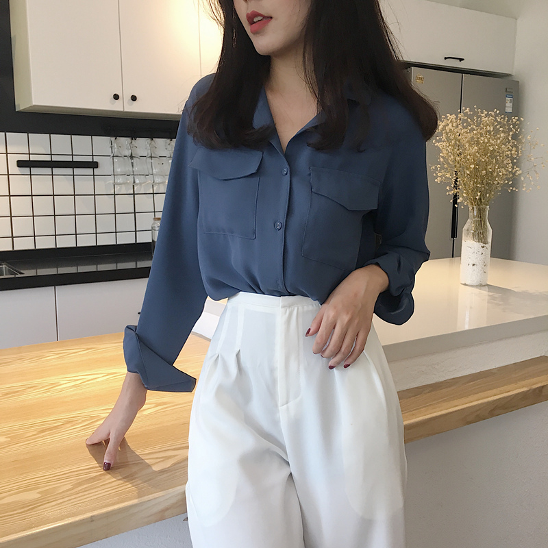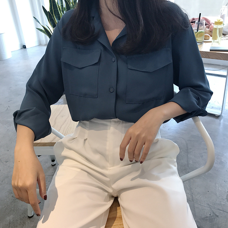 / 秋季新款復古韓國百搭口袋設計雪紡襯衫氣質純色寬松顯瘦上衣潮女