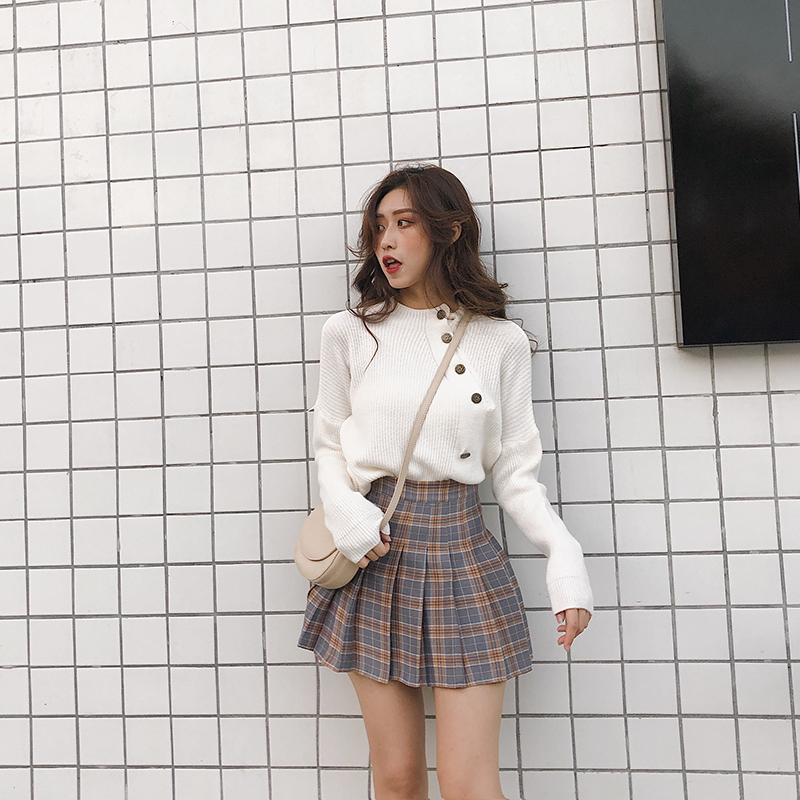 復古學院風時尚高腰A字裙韓版顯瘦百褶裙短裙顯瘦百搭格子半身裙