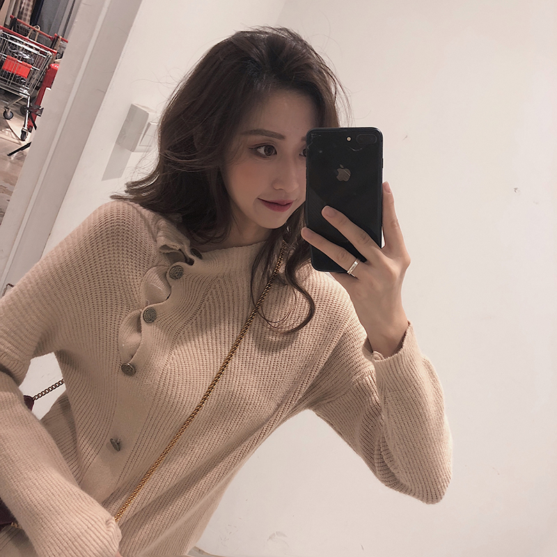 / 韓版純色寬松長袖套裝毛衣女2018新款時尚個性扣子坑條針織衫上衣